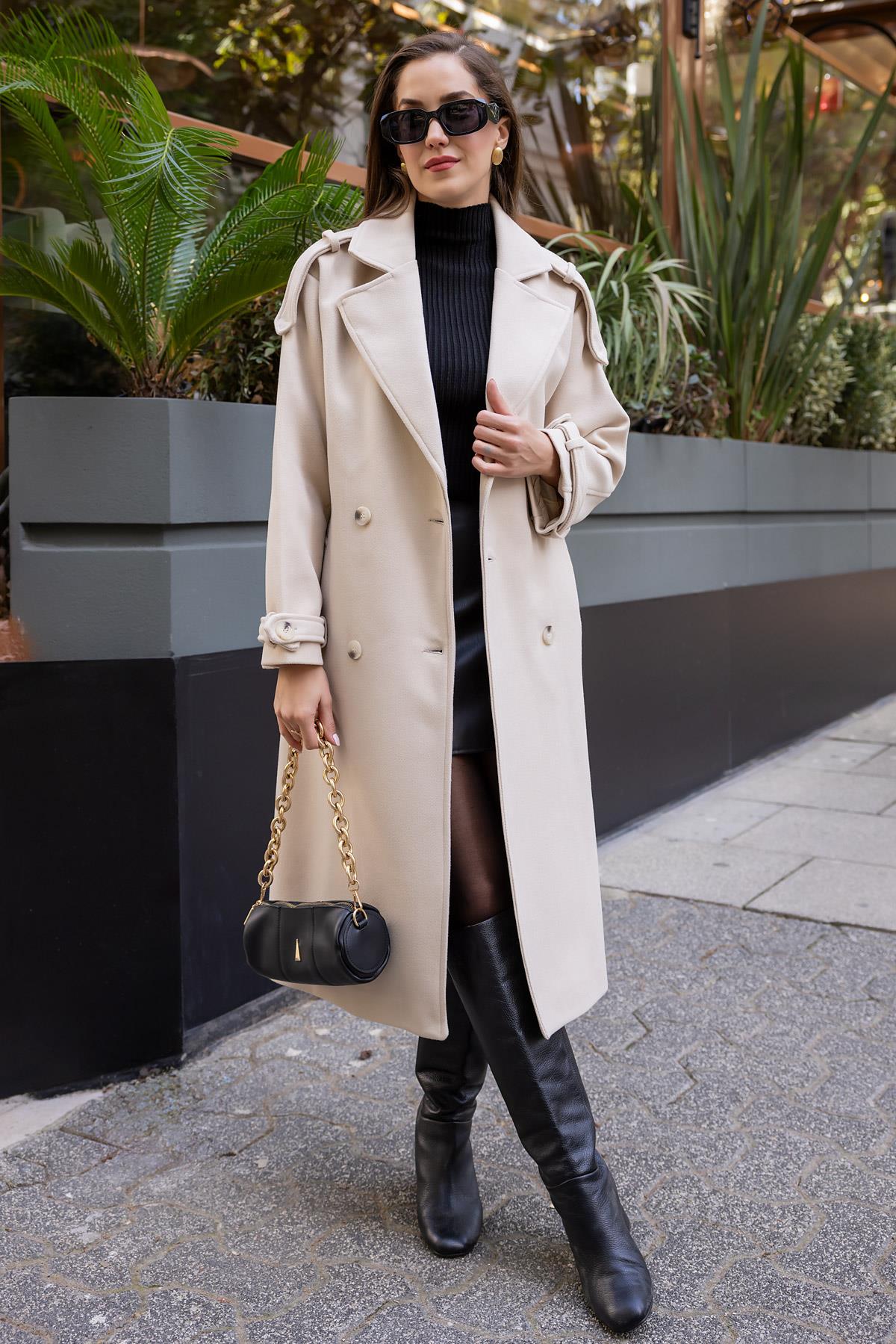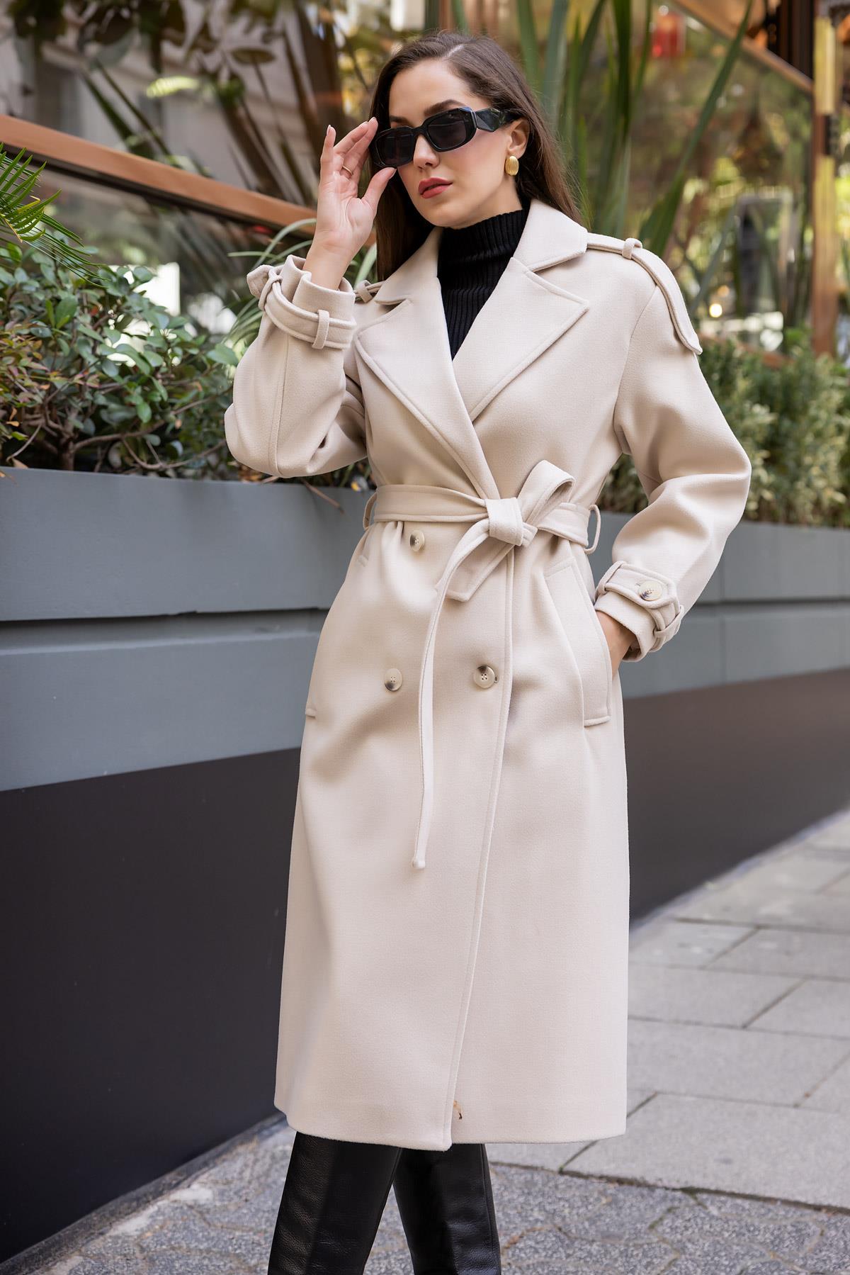 Ürün 36-40 bedene kadar uyumlu, kaşe, çift düğme kapamalı, kuşaklı, kaban olarak tasarlanmıştır.