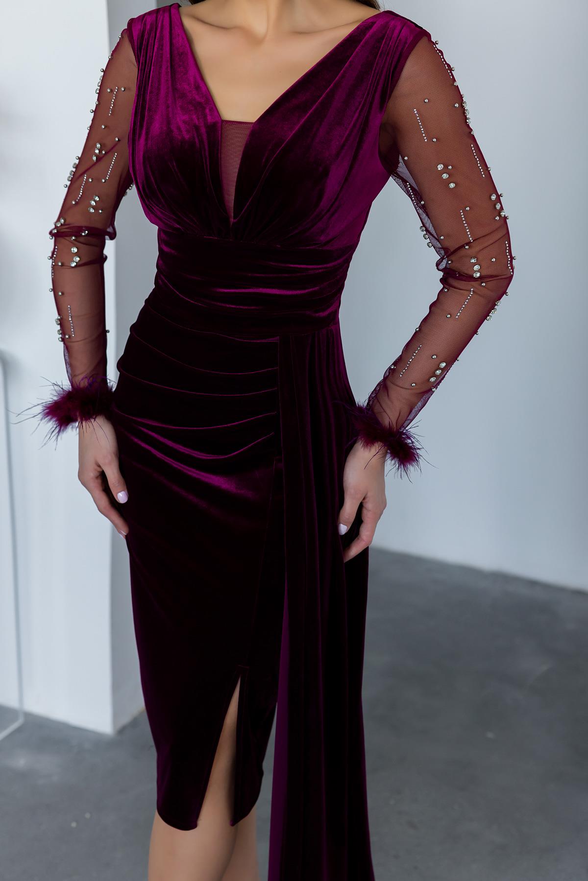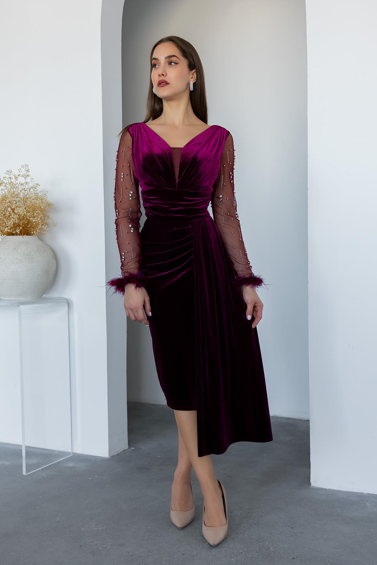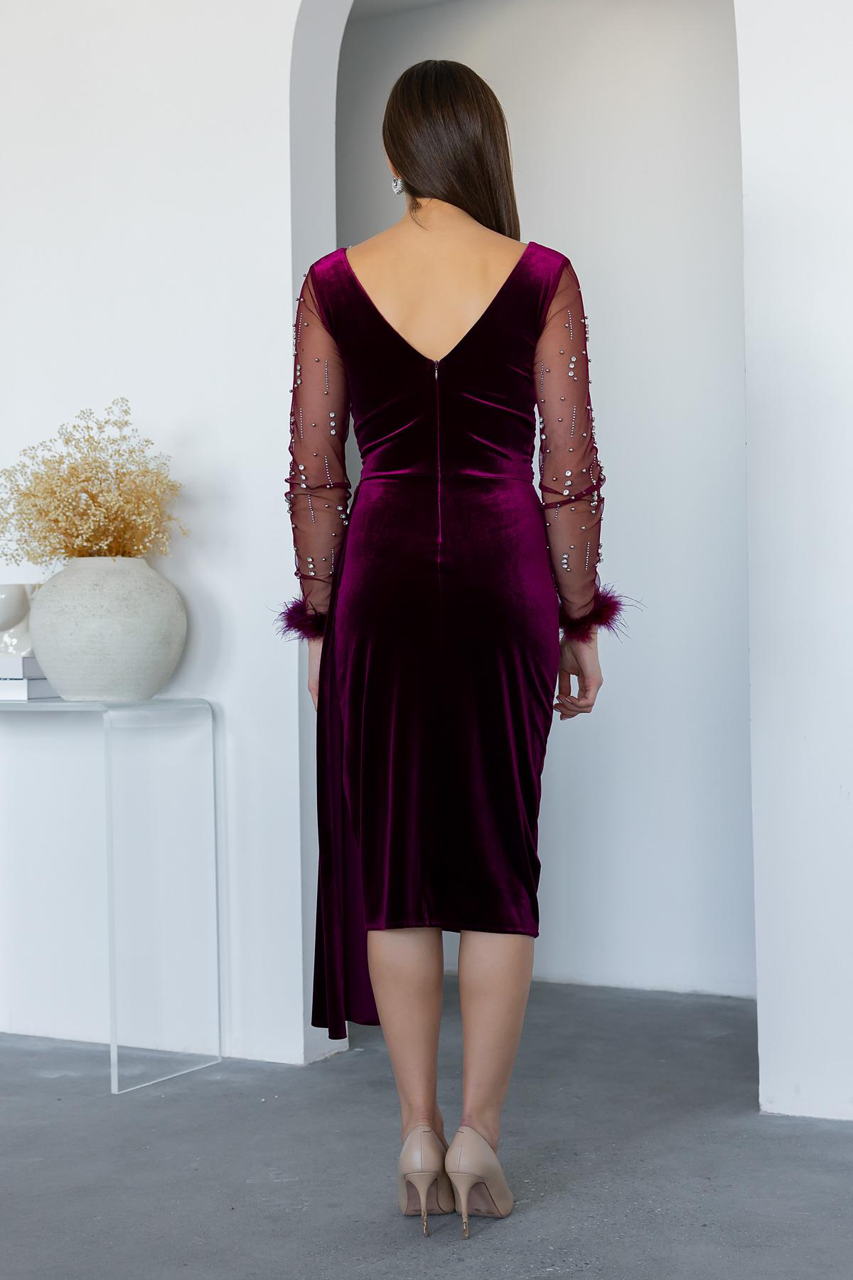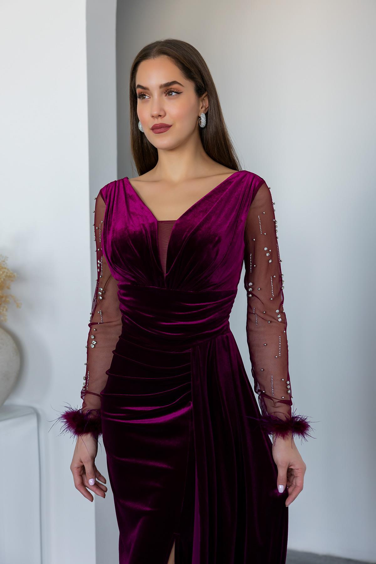 Kol Otrişli Kadife Abiye - BORDO (BEW008ABY0005121)