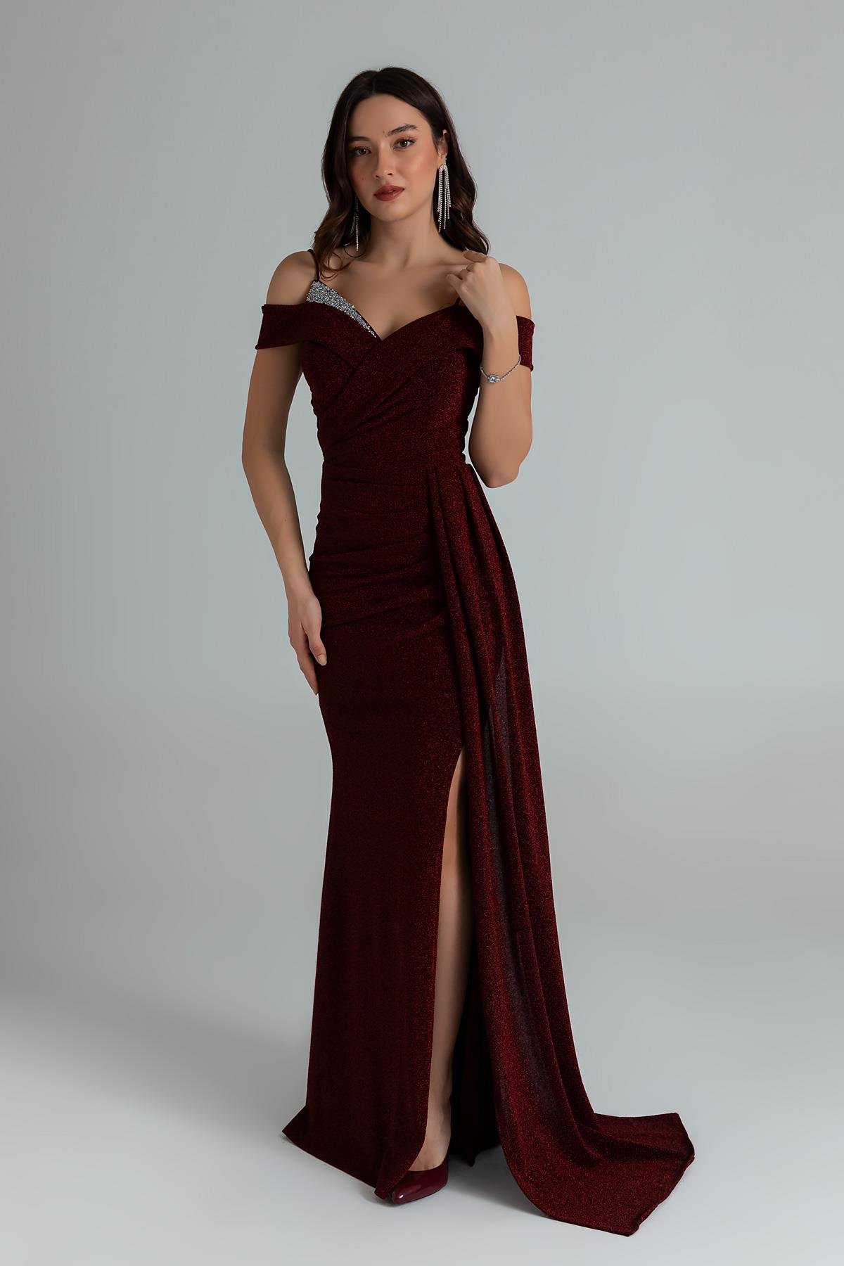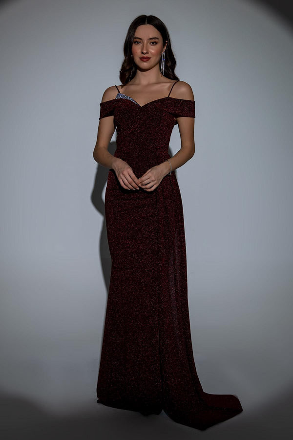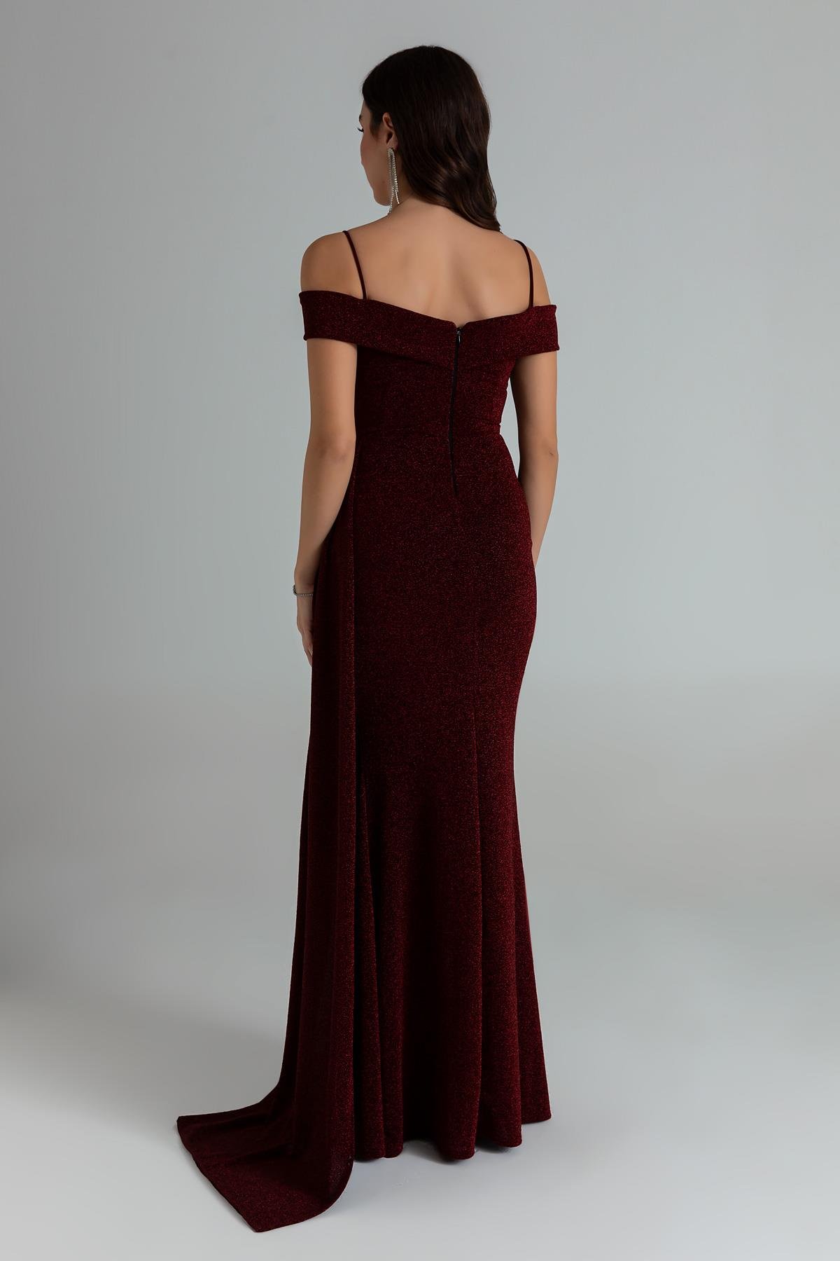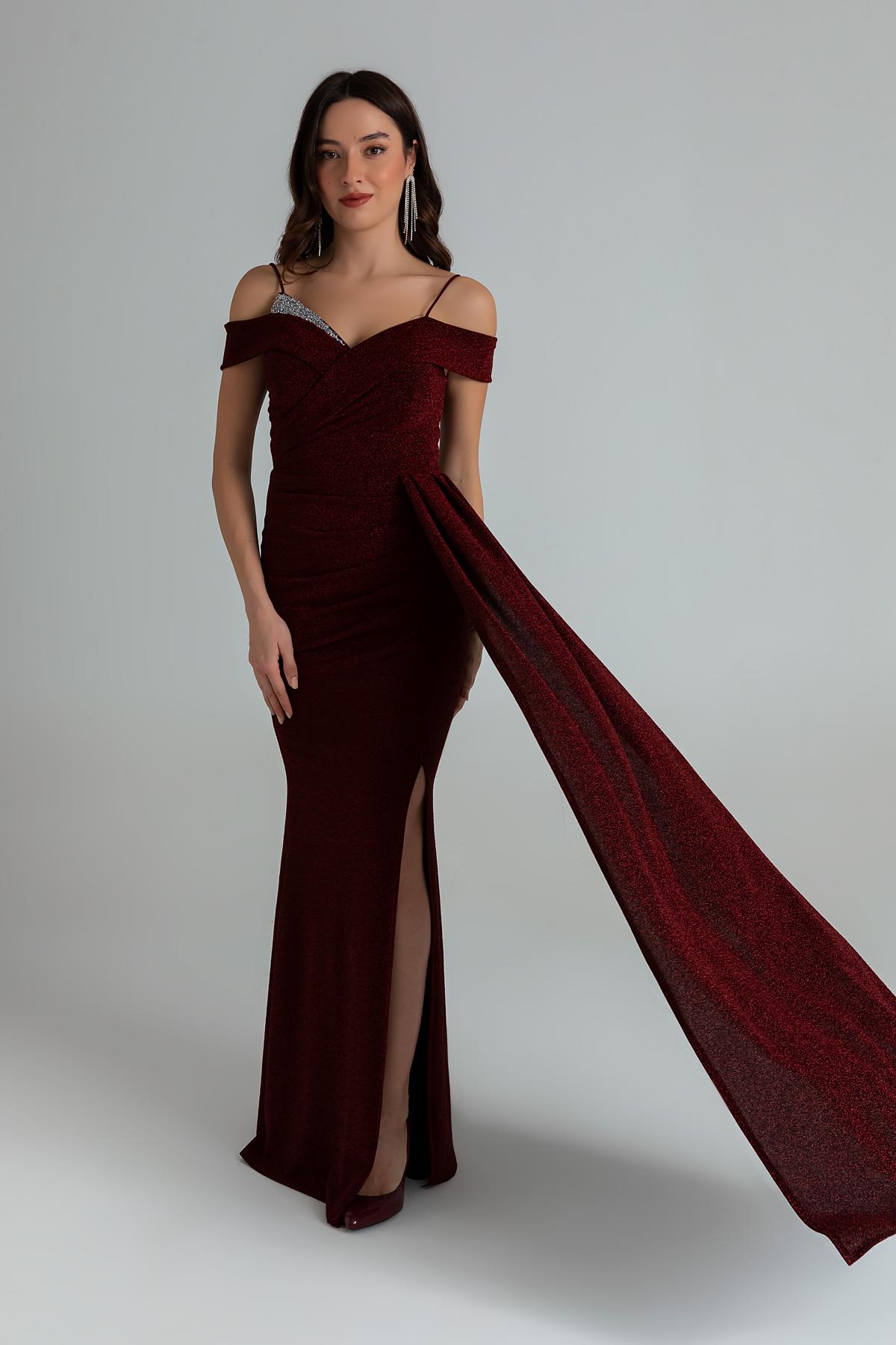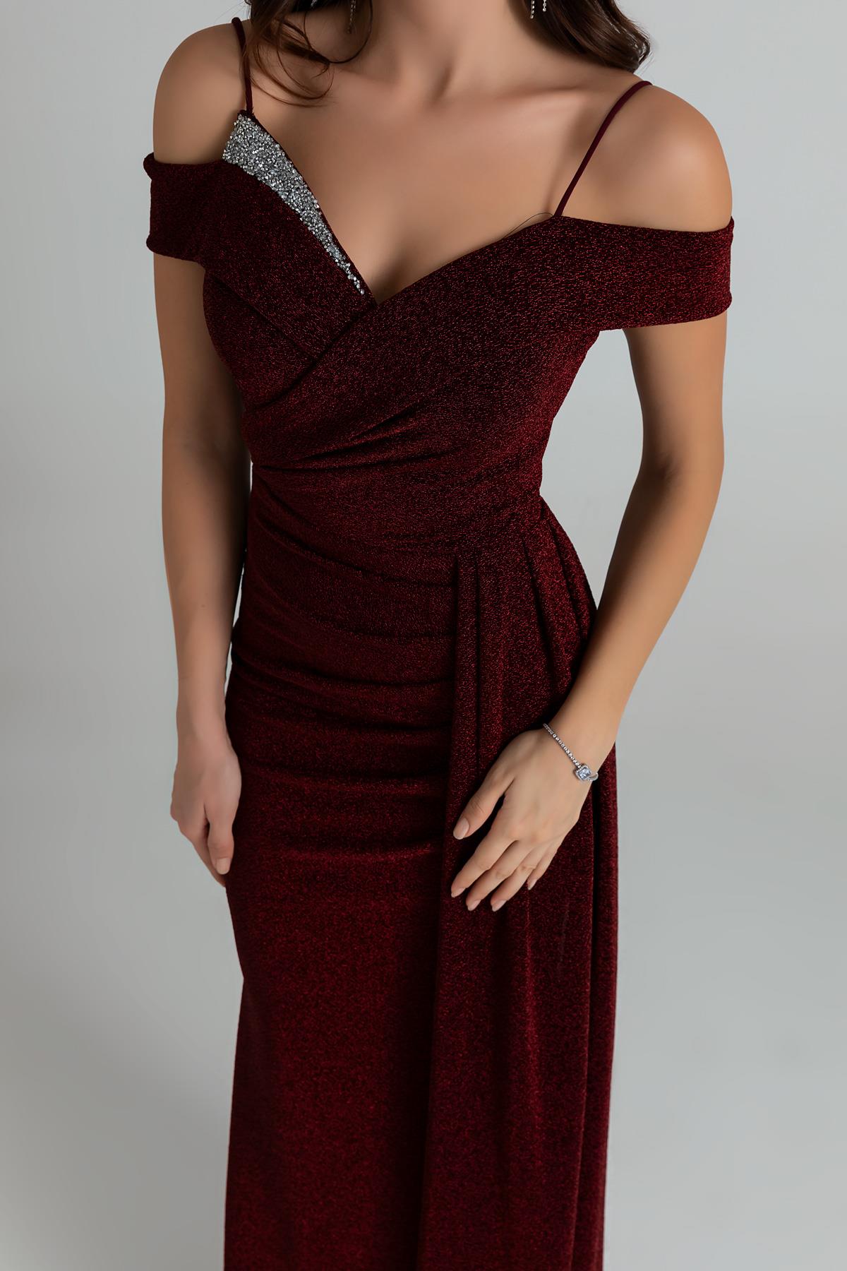 Askılı Simli Uzun Abiye - BORDO (BEW008ABY0009121)