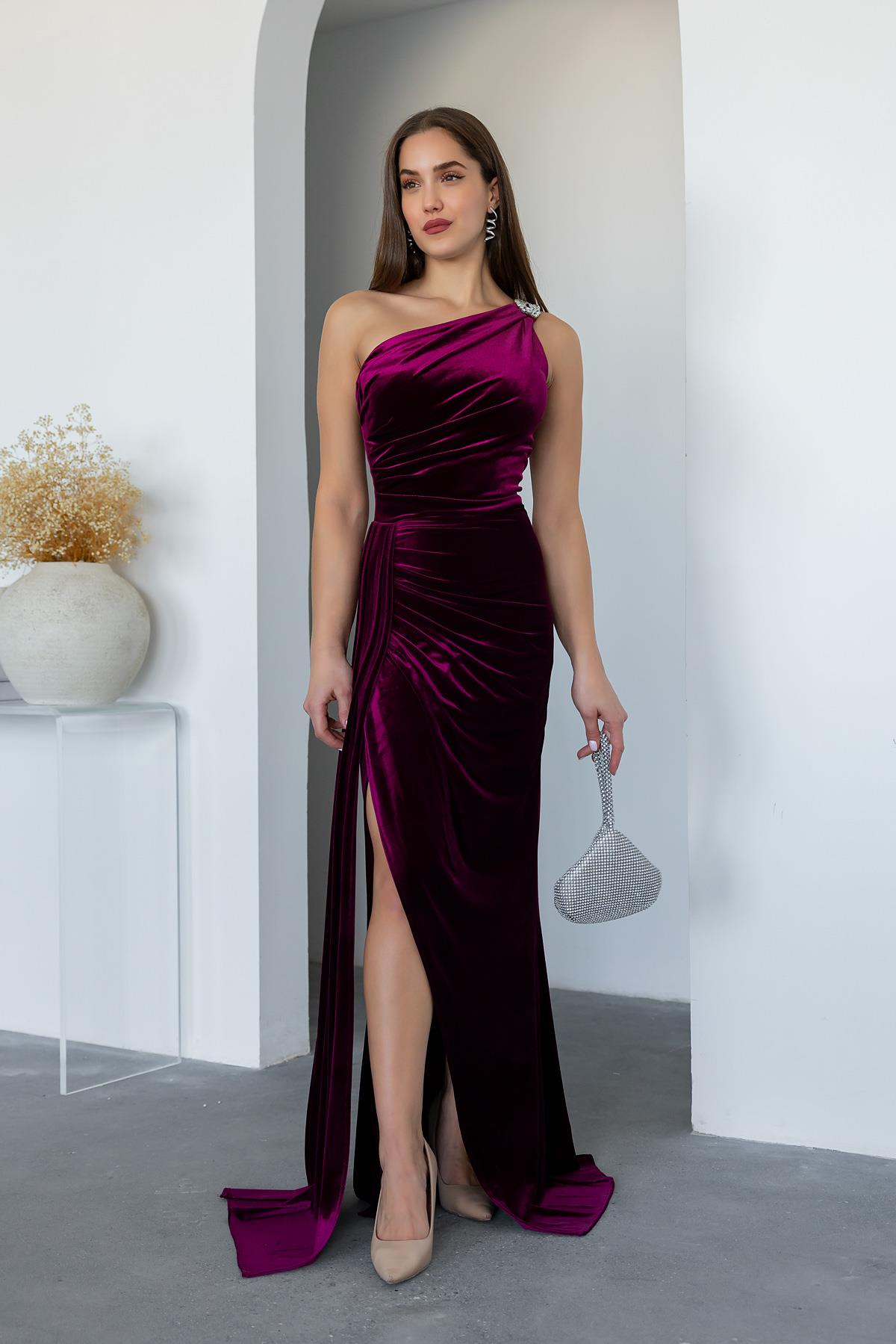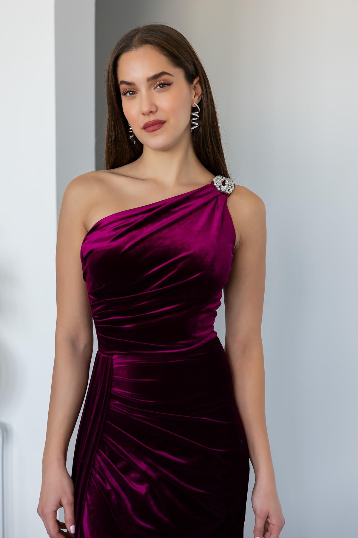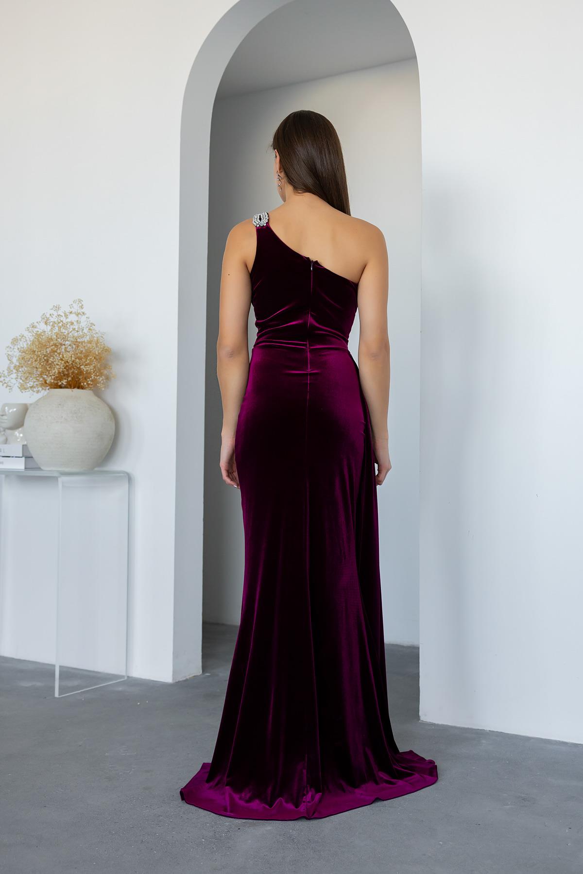 Omuz Taşlı Uzun Kadife Abiye - BORDO (BEW008ABY0006121)
