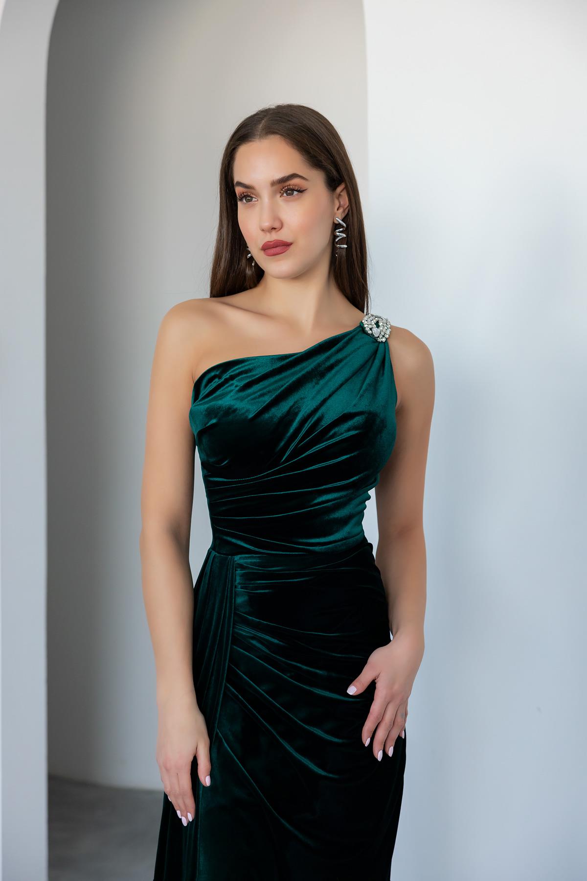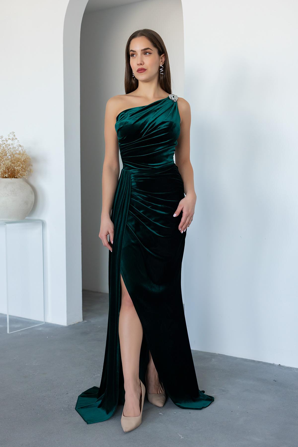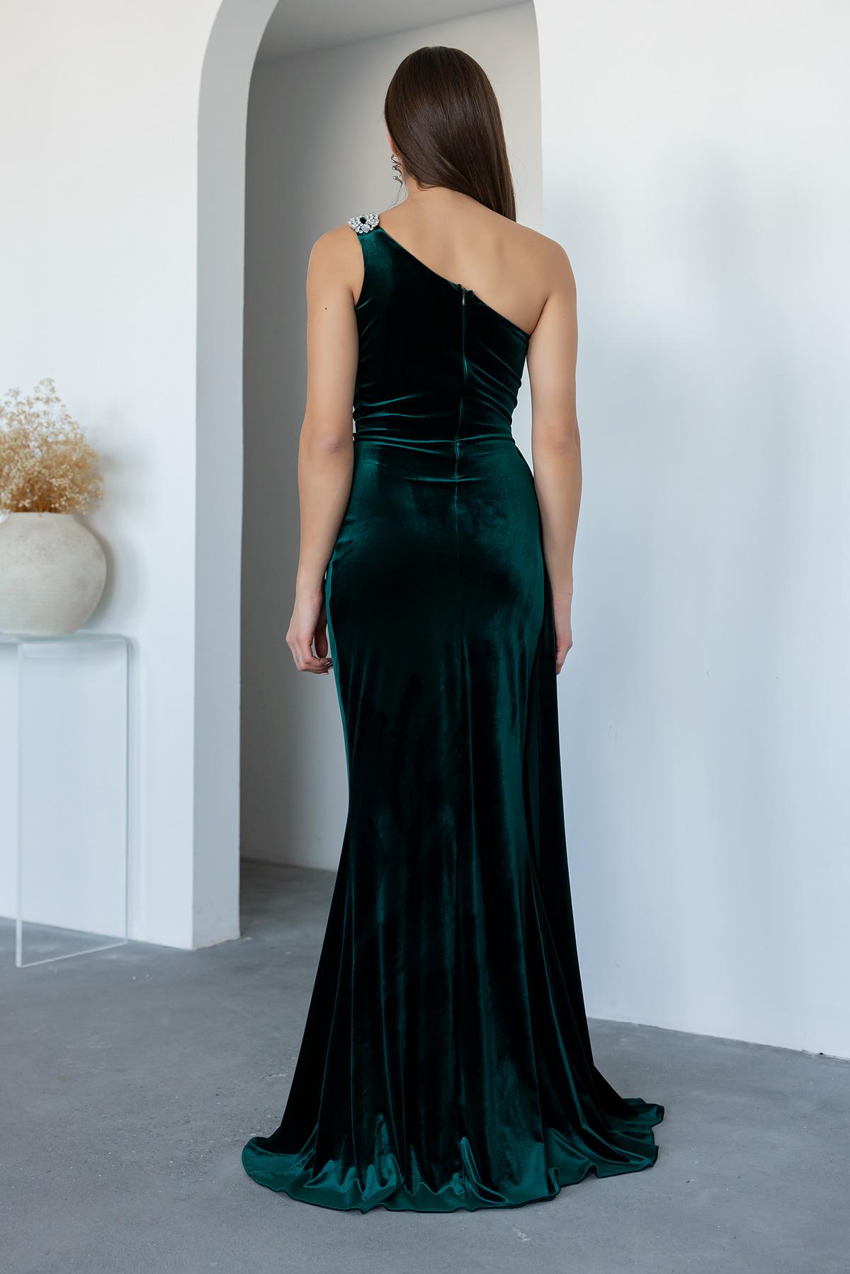 Omuz Taşlı Uzun Kadife Abiye - ZÜMRÜT YEŞİL (BEW008ABY0006201)