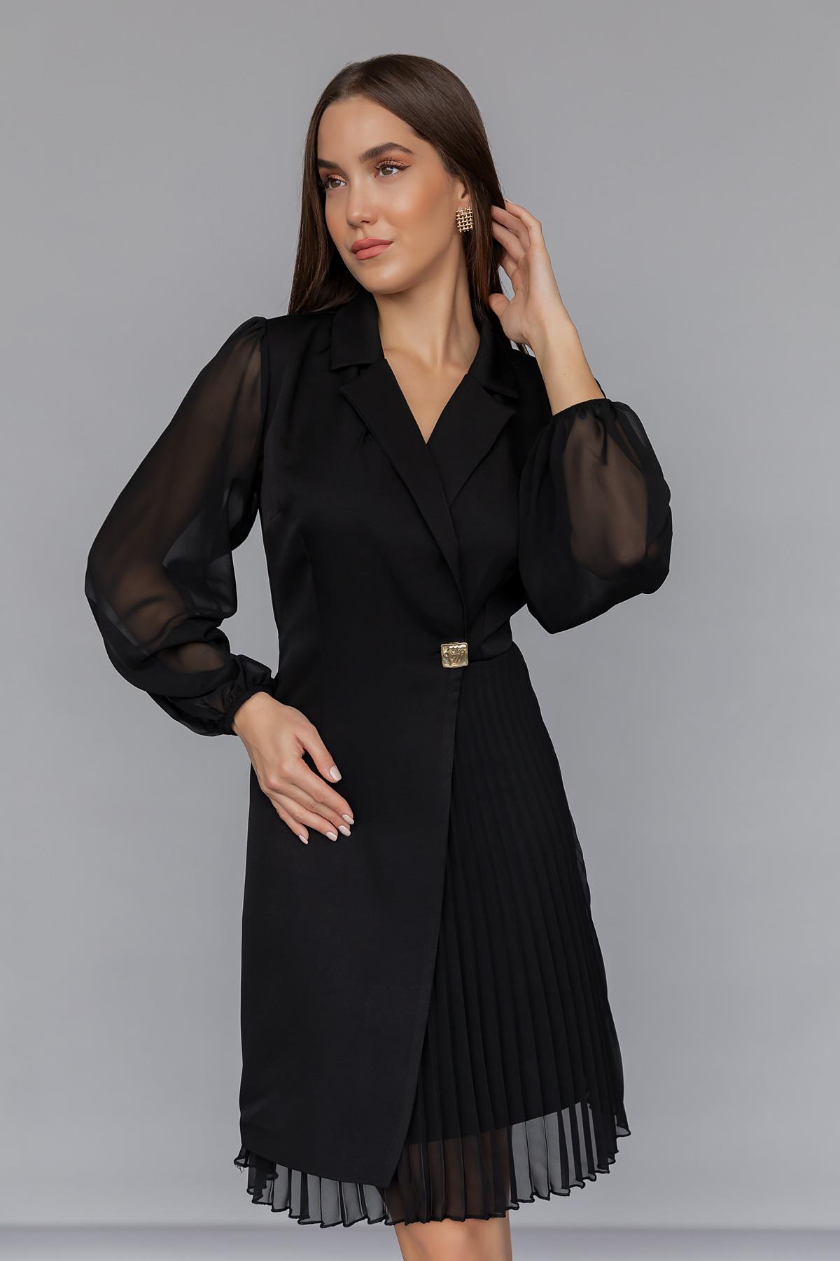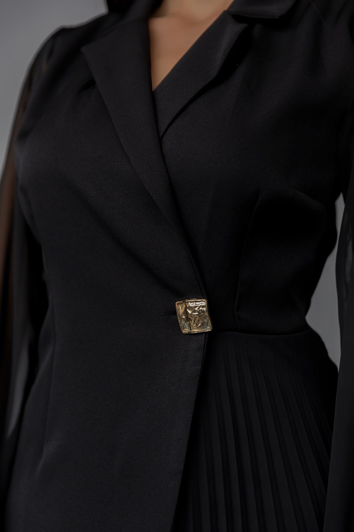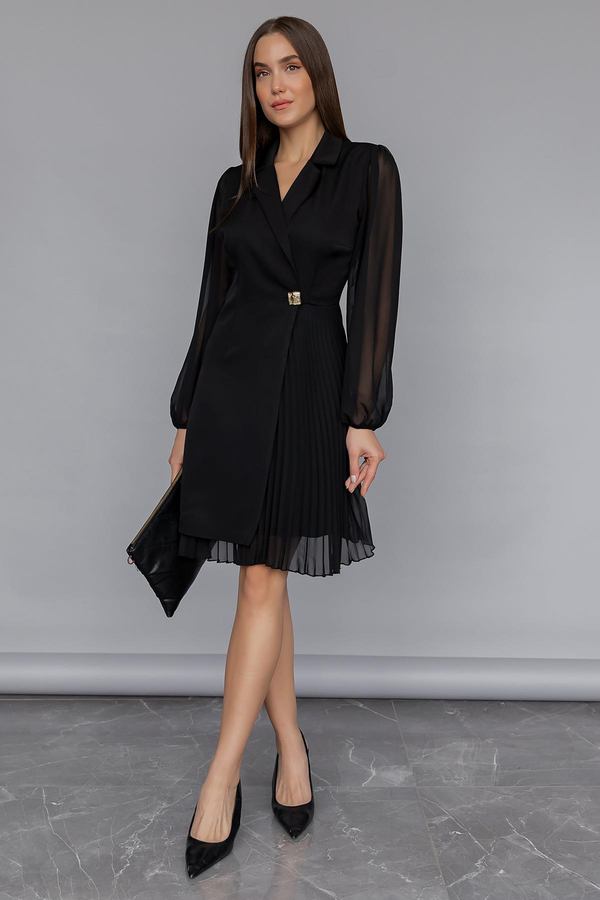 Ürün 36-42 bedene kadar uyumlu, yan fermuar kapamalı, gold düğmeli, omuz vatkalı, kruvaze yaka, kolları şifon, eteği piliseli elbise olarak tasarlanmıştır.