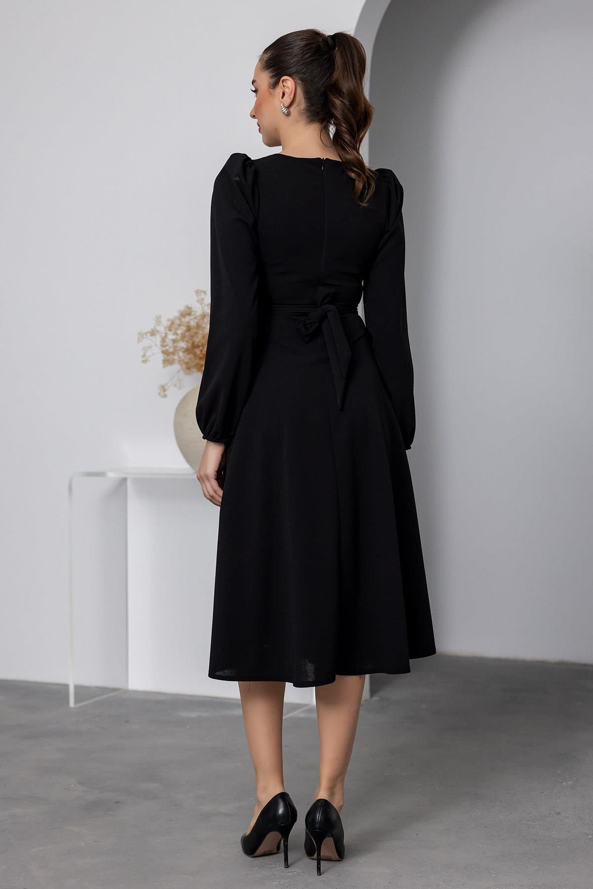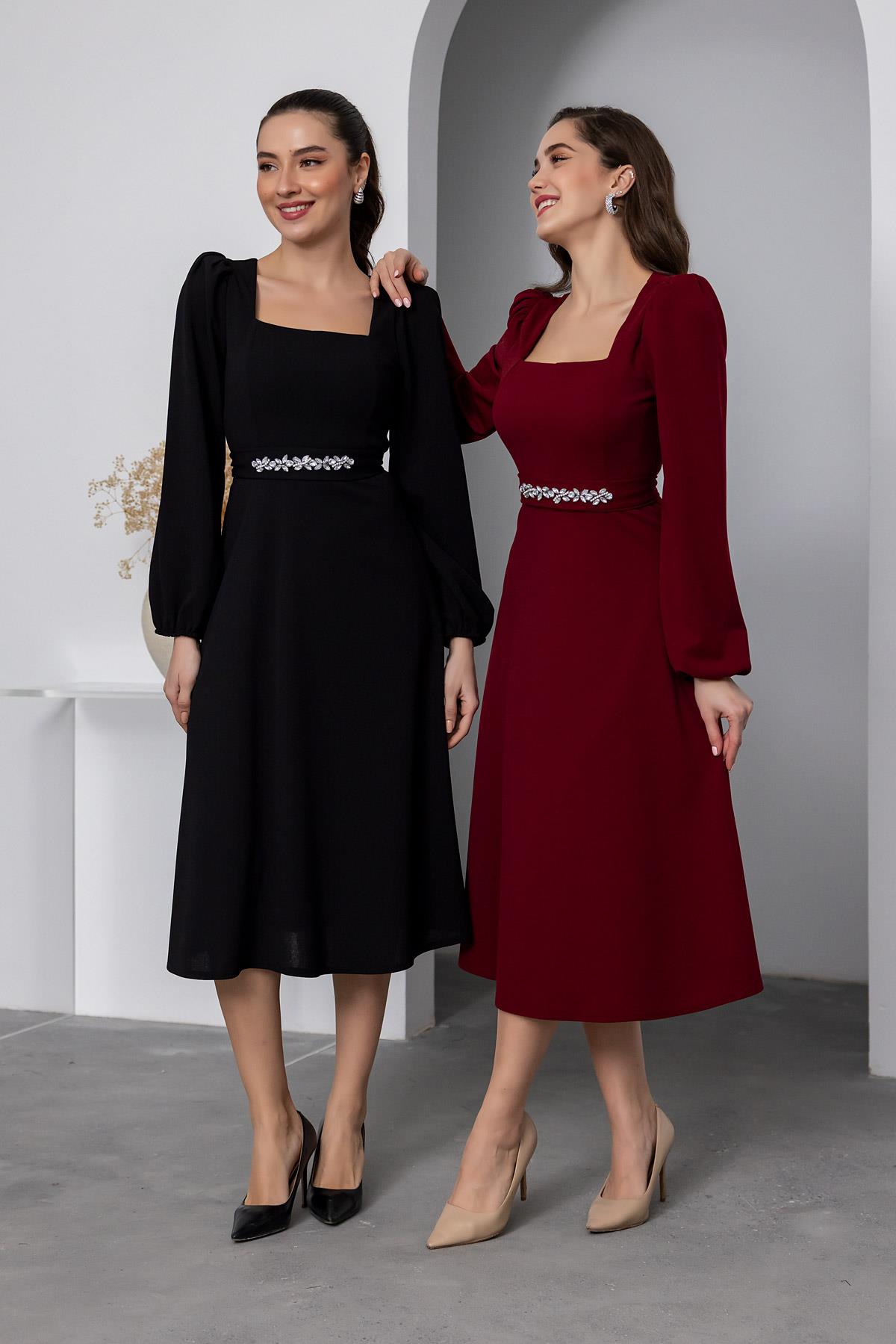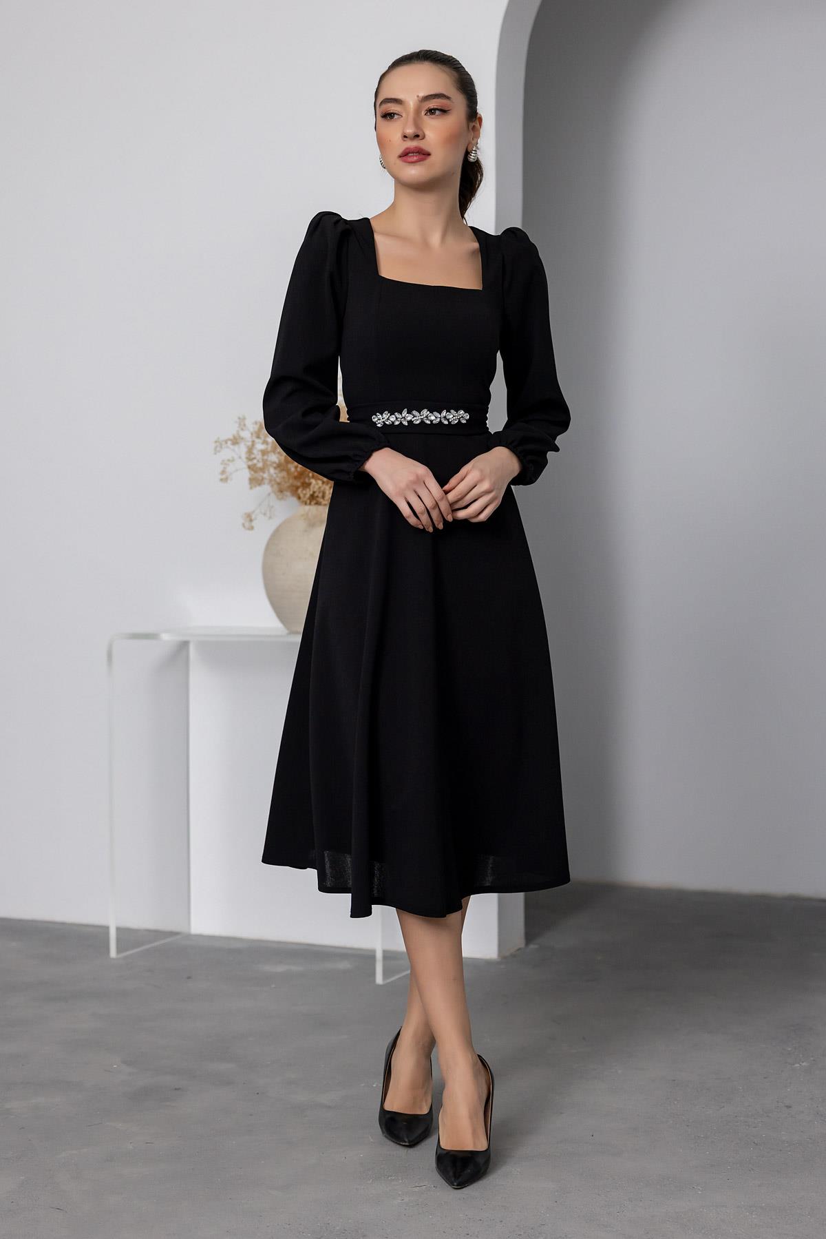 Taş Kuşaklı Kare Yaka Elbise - SİYAH (BEW531ELB0044100)
