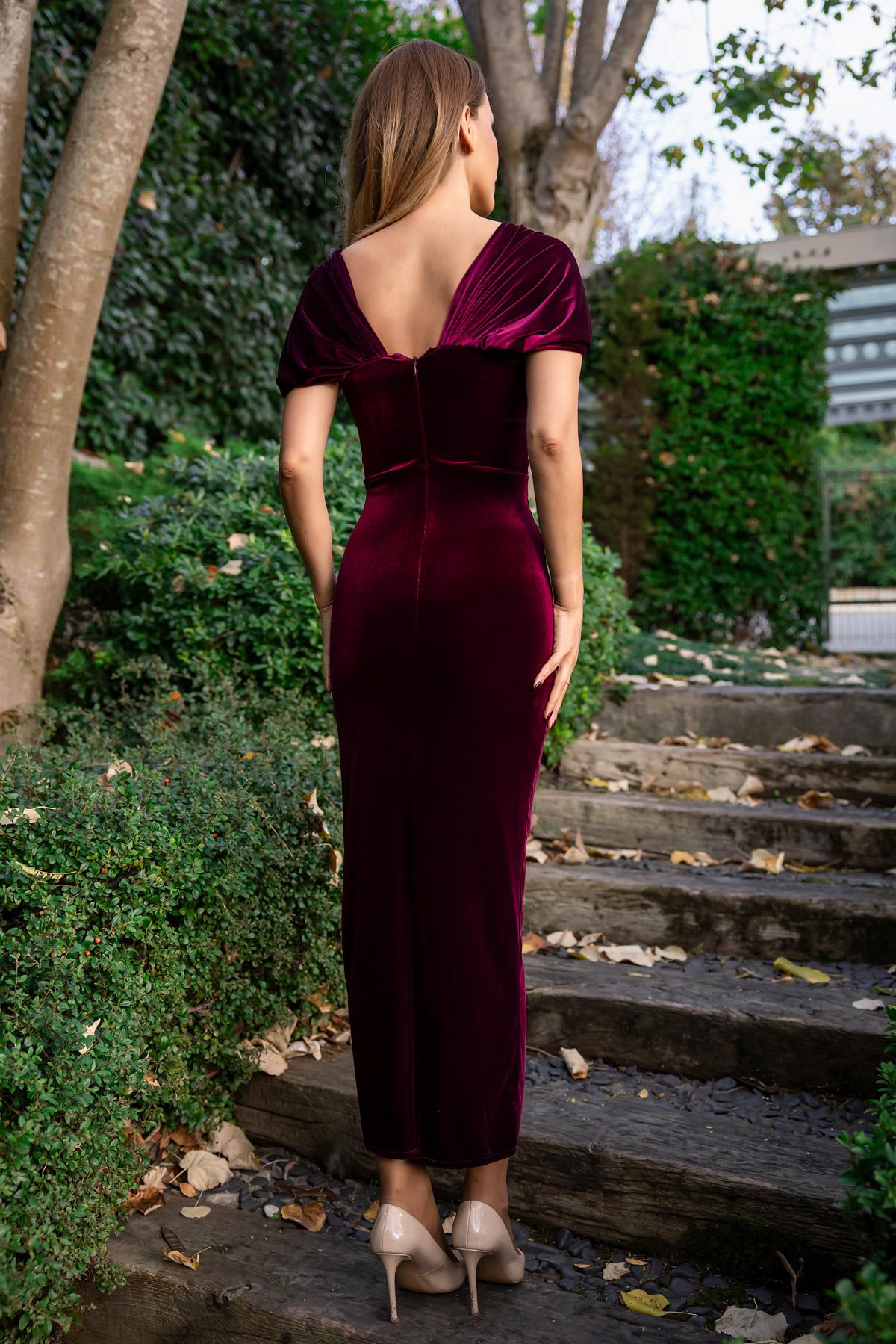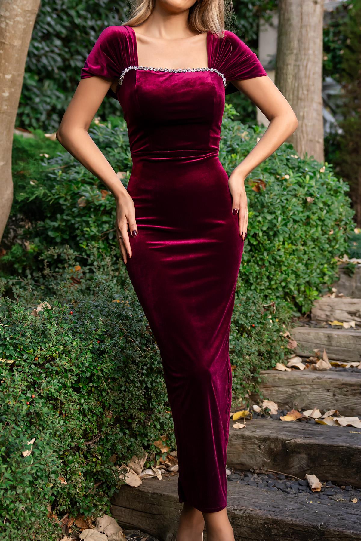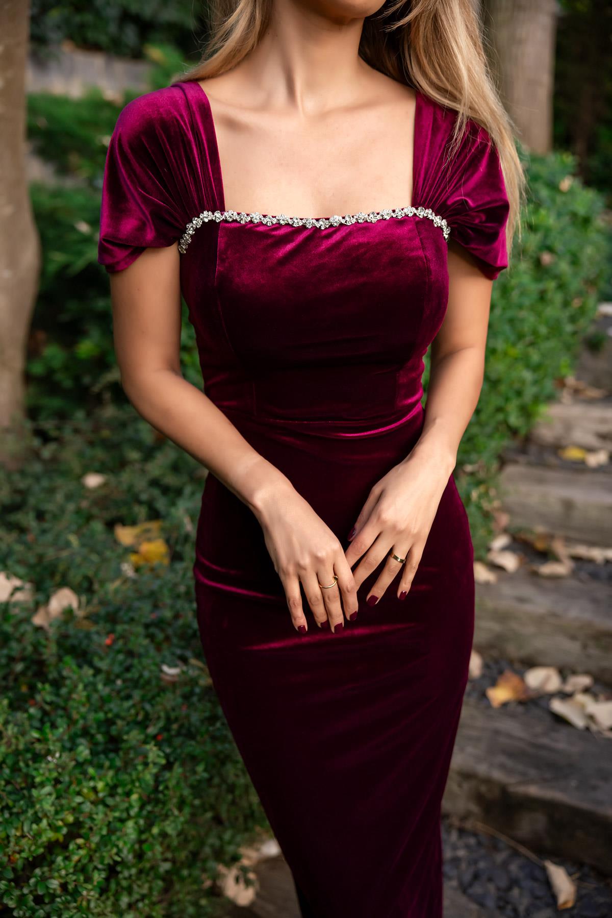 Göğüs Taşlı Kadife Abiye - MÜRDÜM (BEW008ABY0008142)