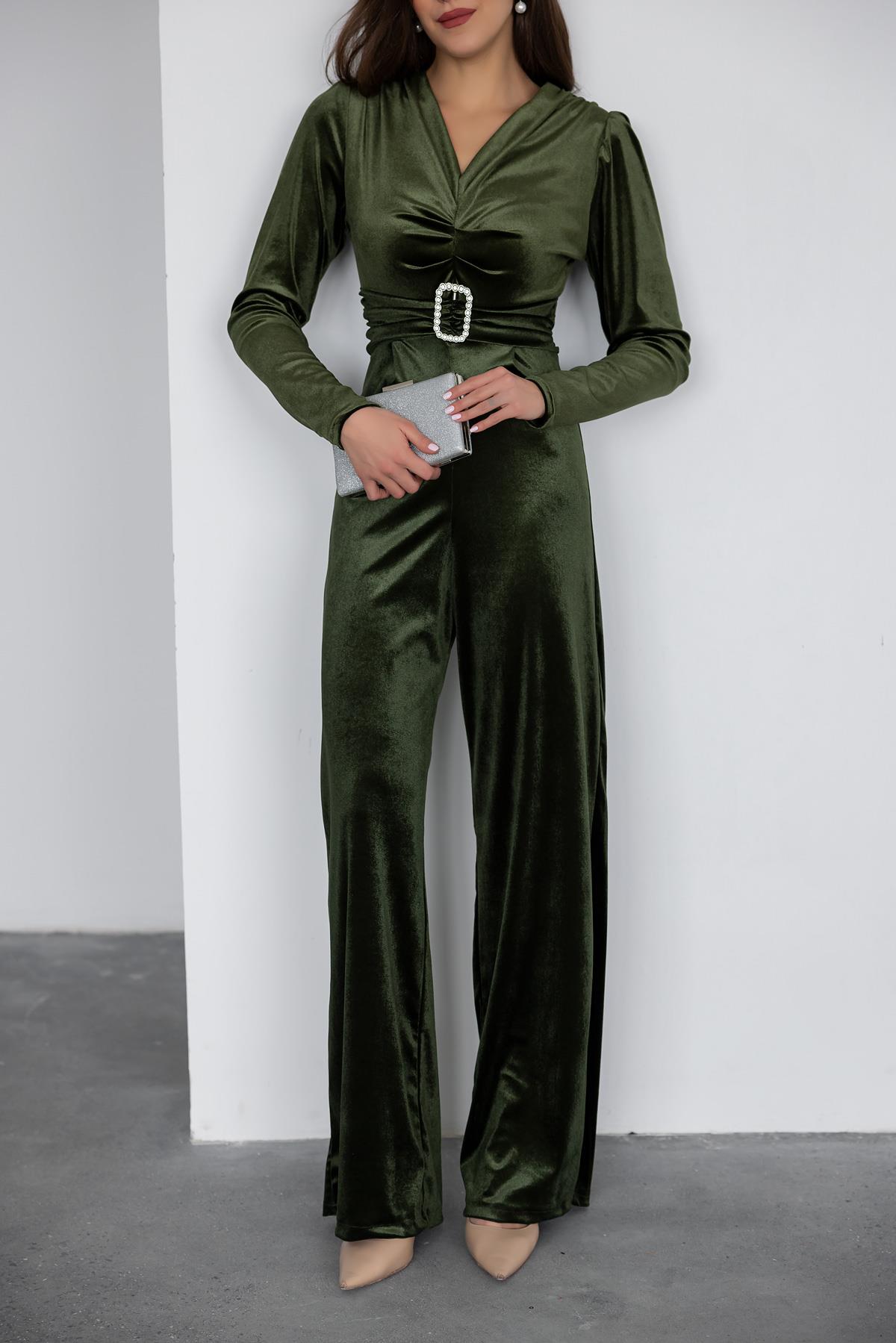 Ürün 36-42 bedene kadar uyumlu, bel toka degtaylı, ön büzgü detaylı, uzun kollu, kadife, tulum olarak tasarlanmıştır.