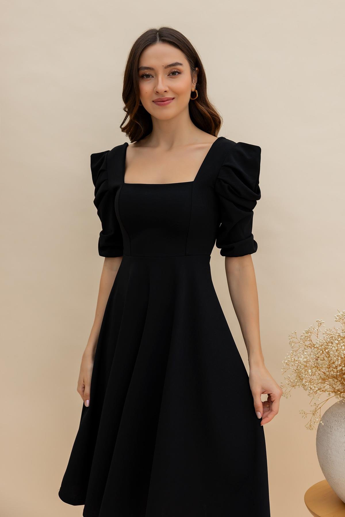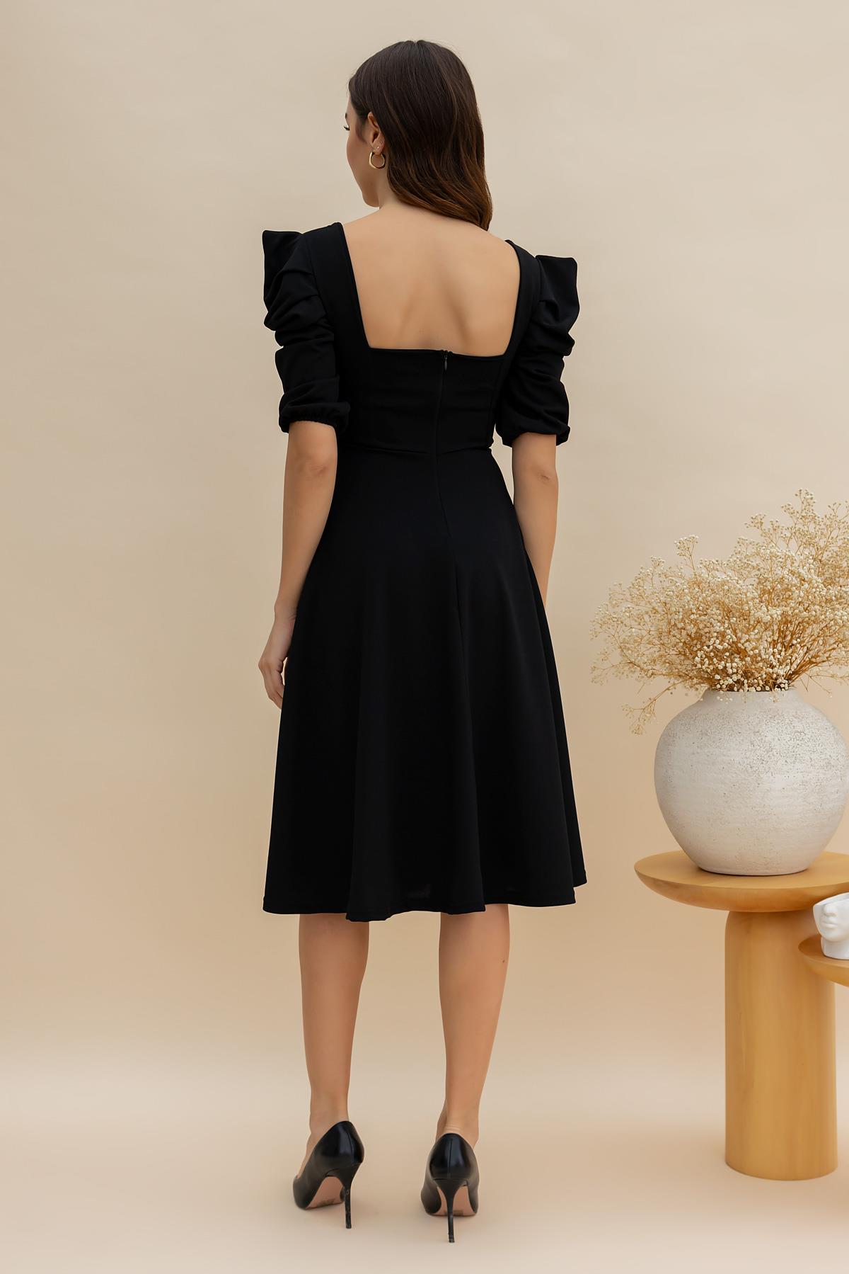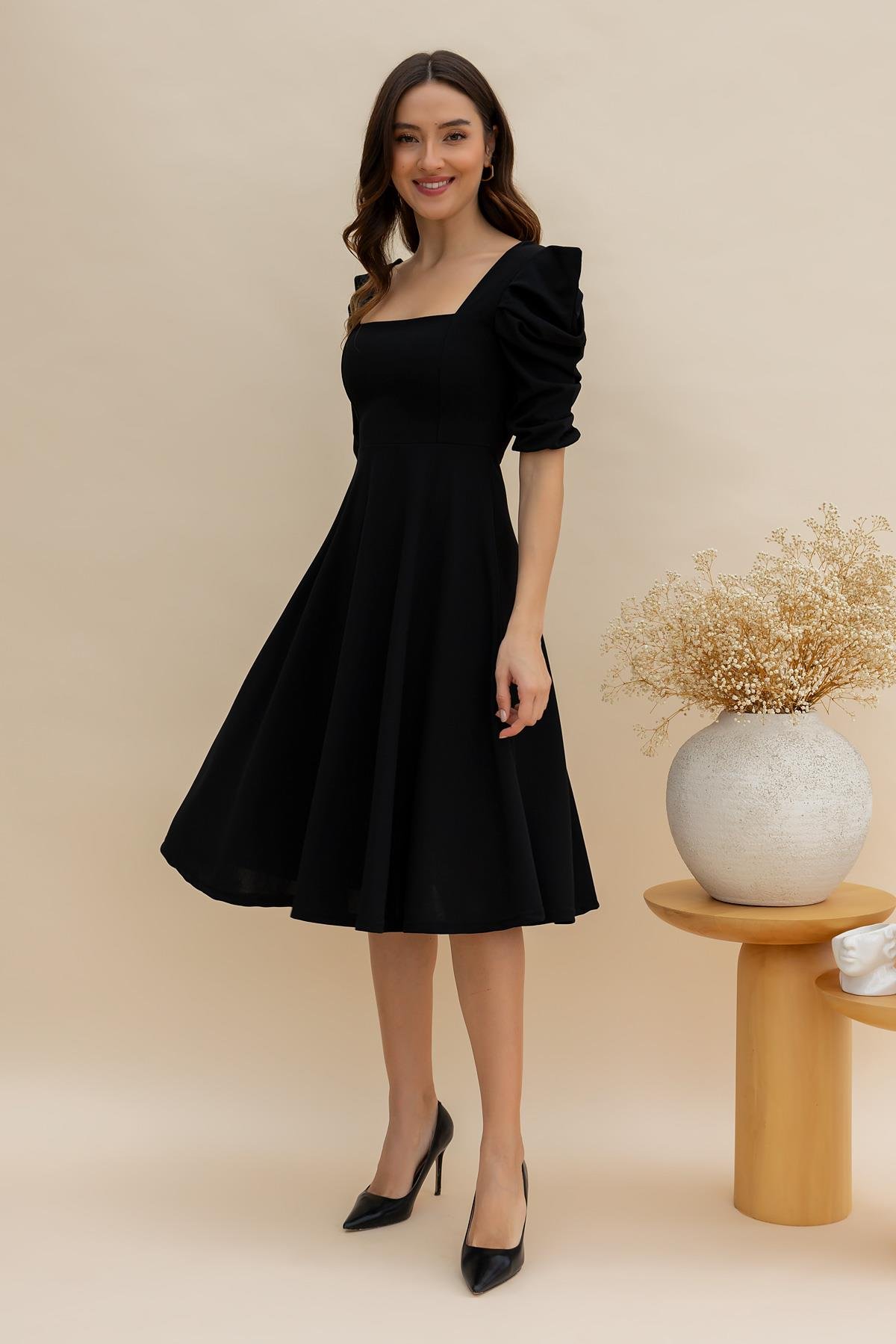 Ürün 36-40 bedene kadar uyumlu, tam kalıptır, likralı, kalın tok kumaş, kare yaka, büzgülü kol, arka fermuar kapamalı, volanlı, midi elbise olarak tasarlanmıştır.