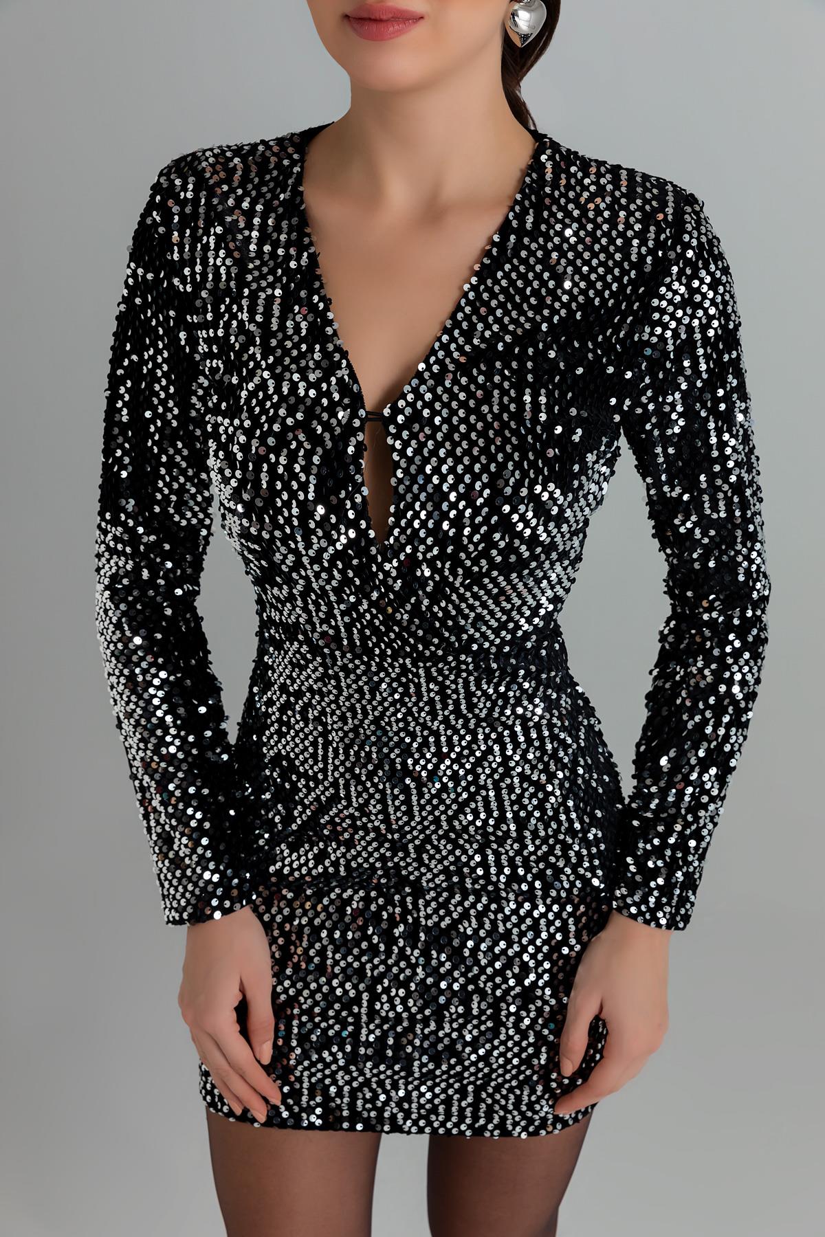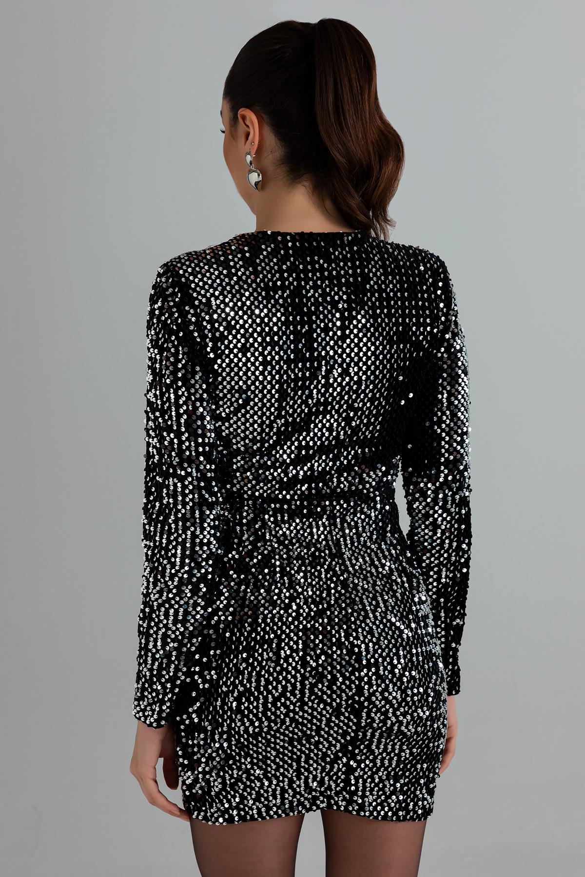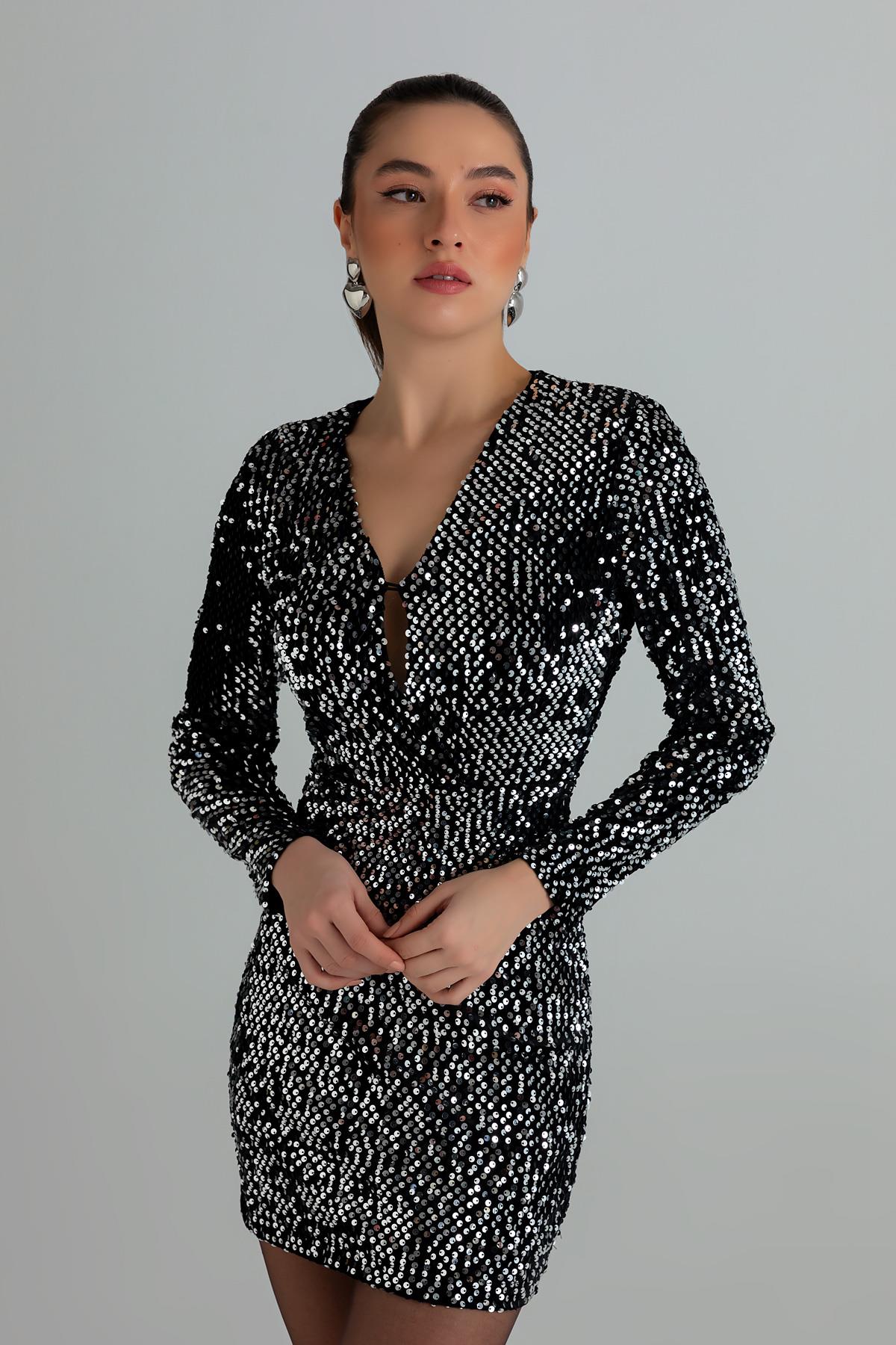 Ürün 36-40 bedene kadar uyumlu, kruvaze yakalı, pul payetli, uzun kollu, elbise olarak tasarlanmıştır.