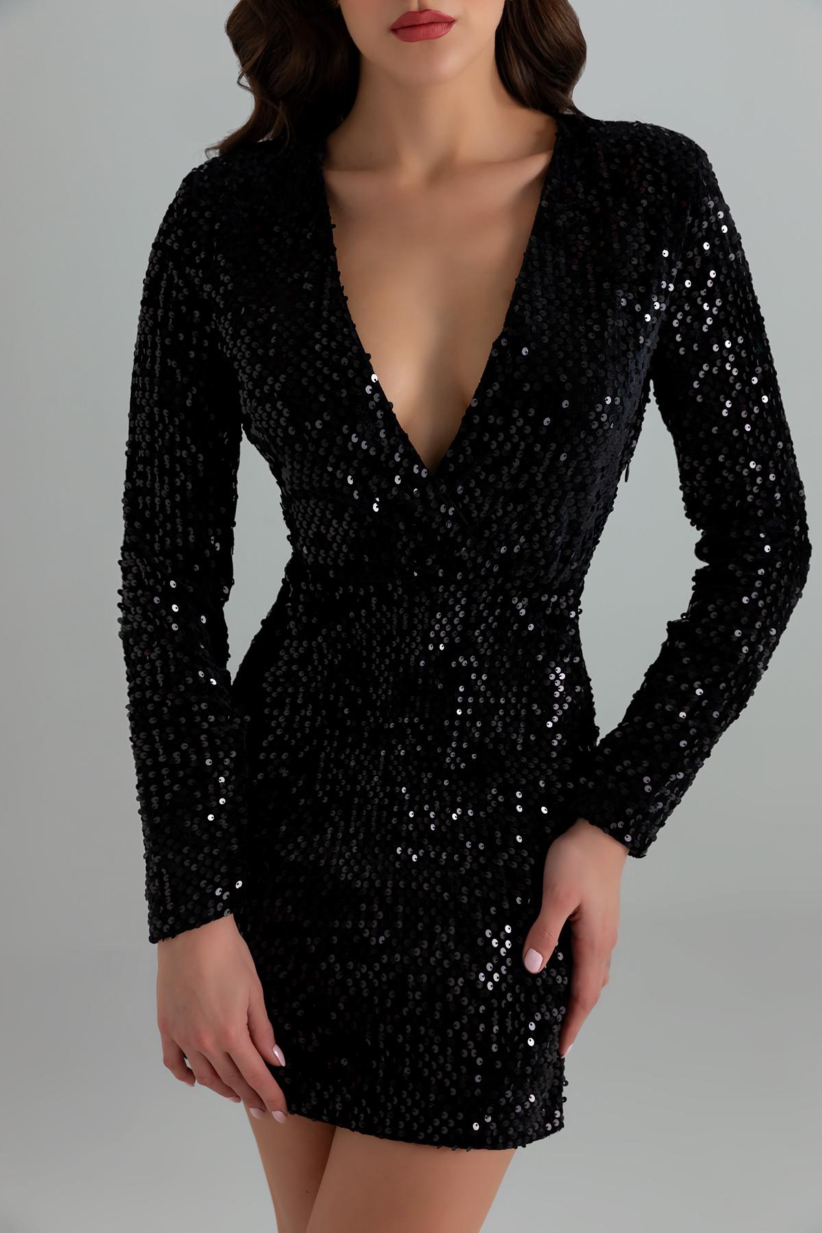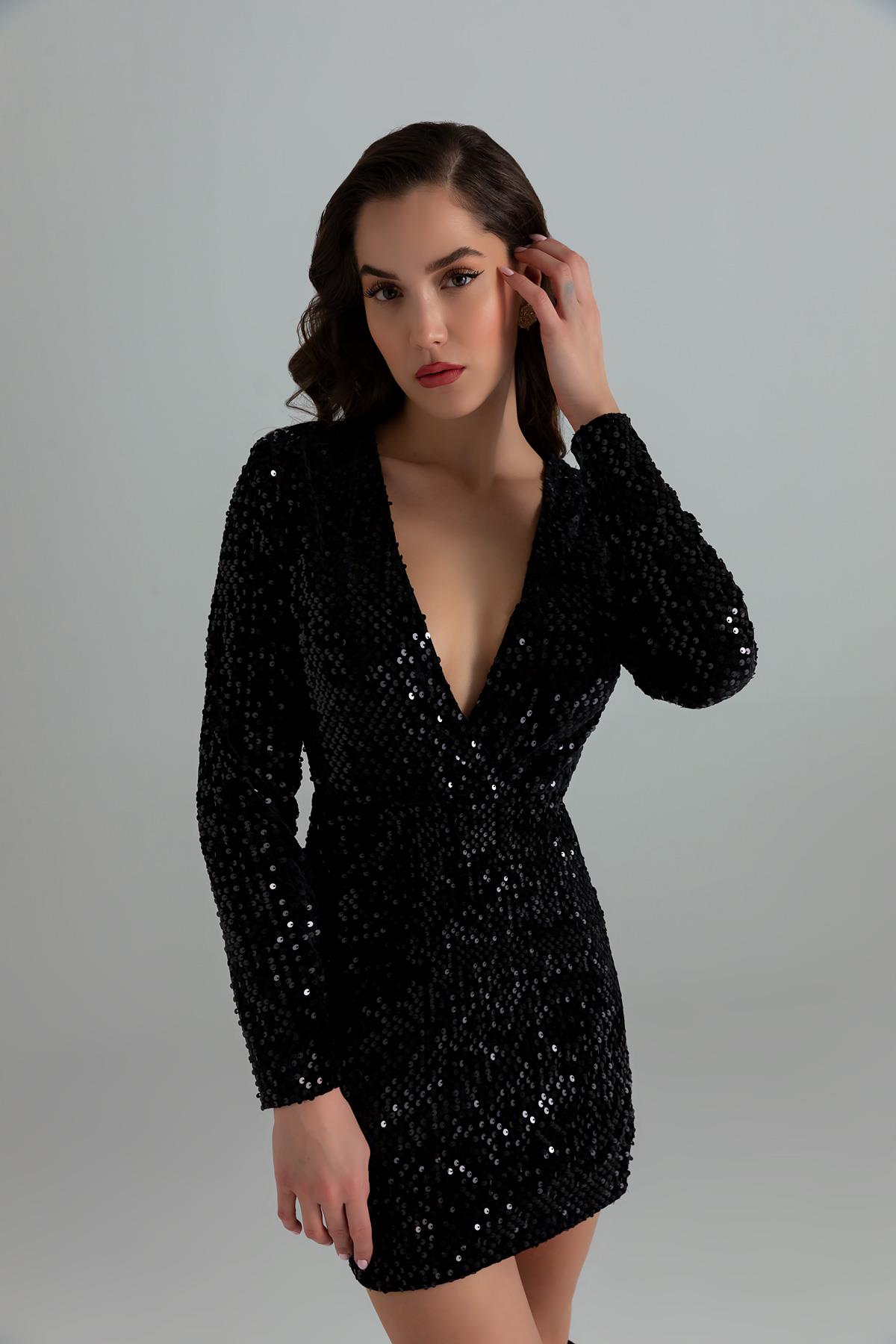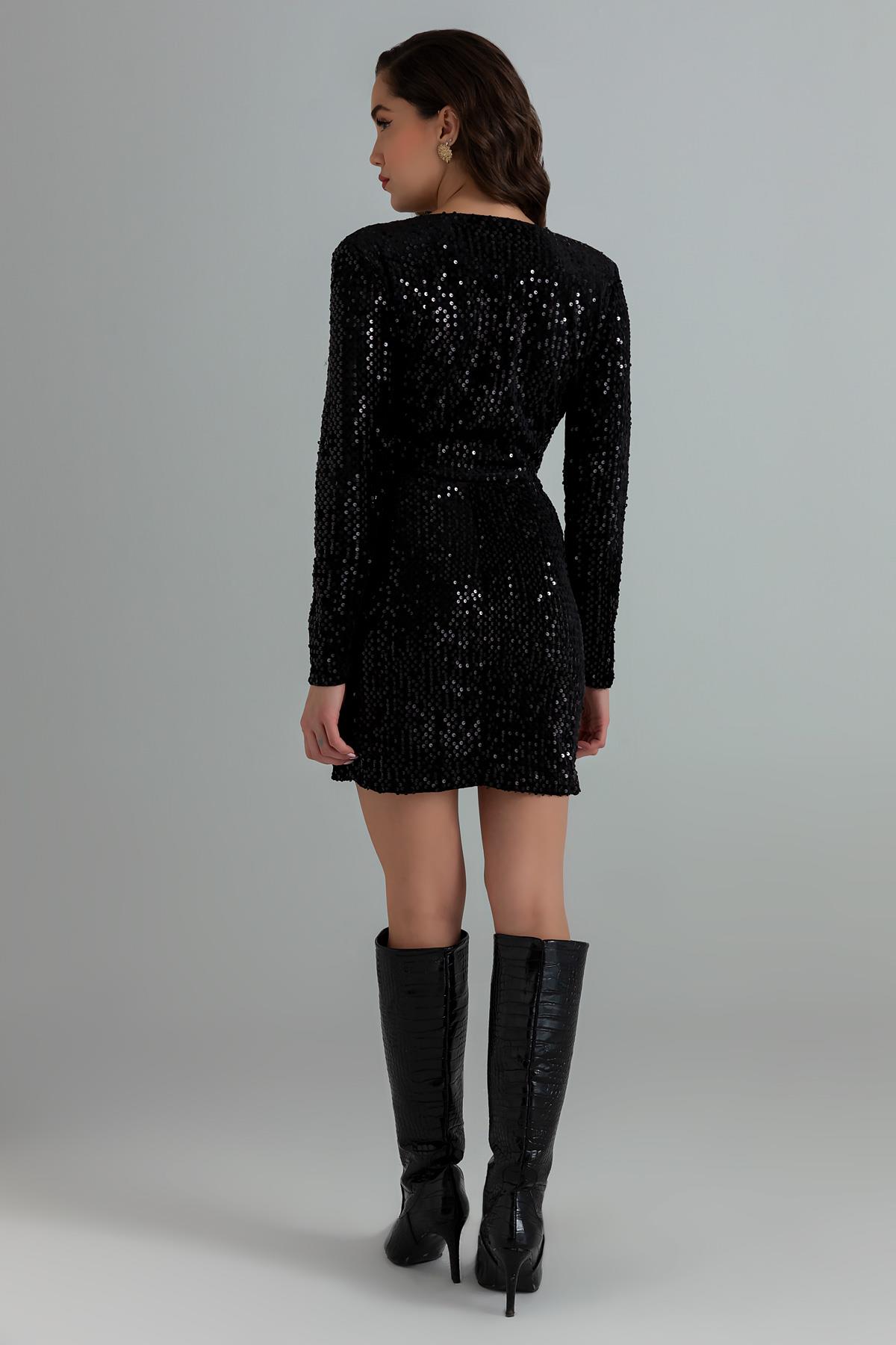 Ürün 36-40 bedene kadar uyumlu, kruvaze yakalı, pul payetli, uzun kollu, elbise olarak tasarlanmıştır.