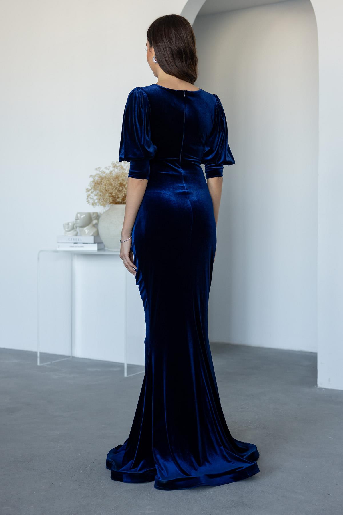 Kruvaze Yaka Kadife Abiye - LACİVERT (BEW008ABY0004110)