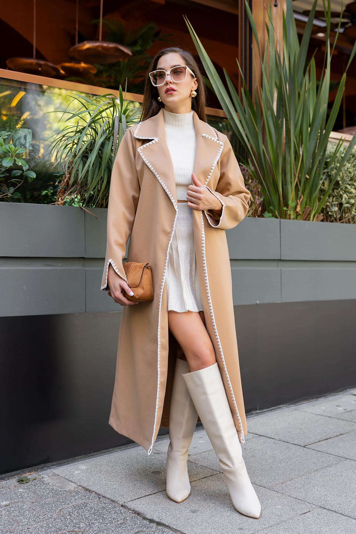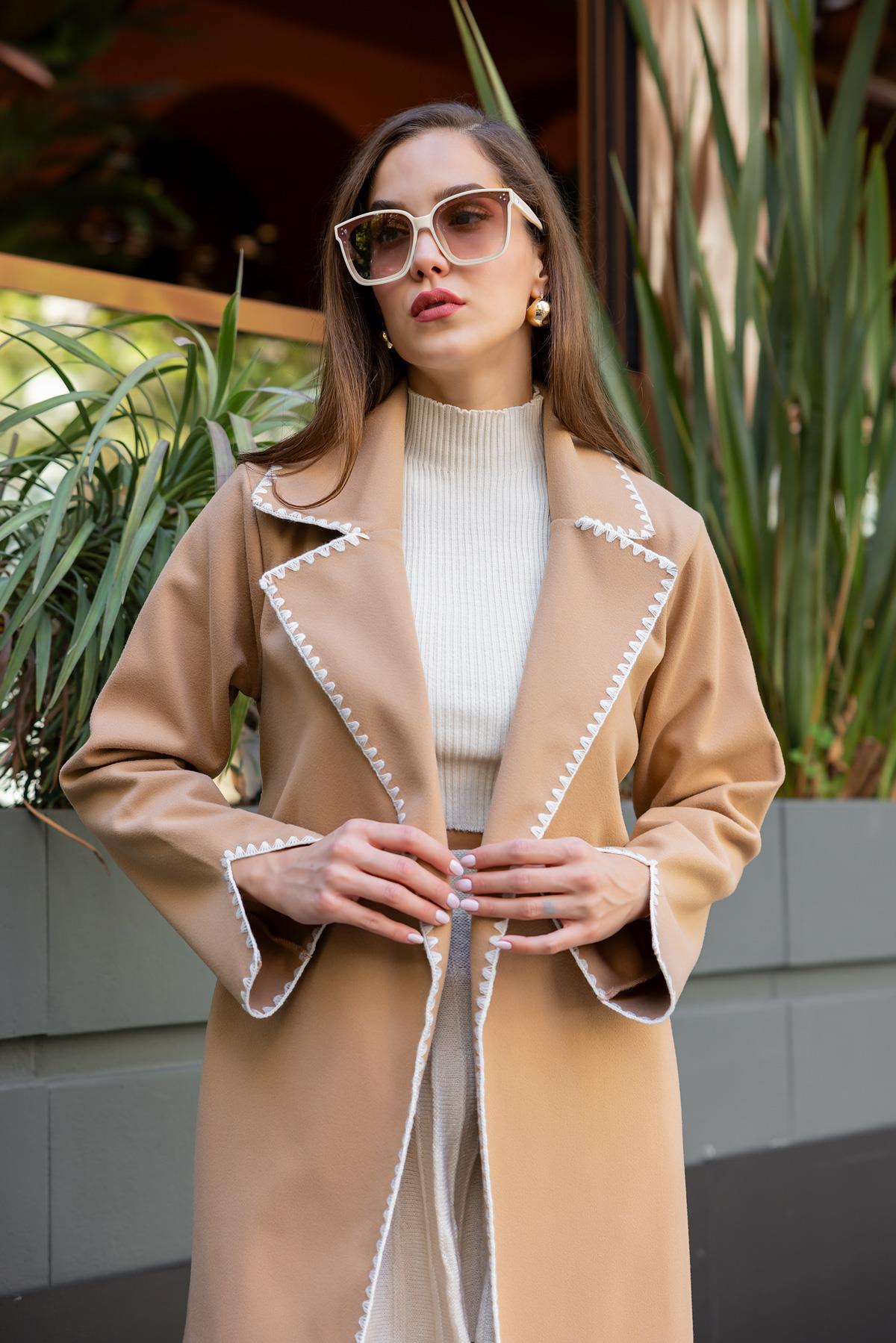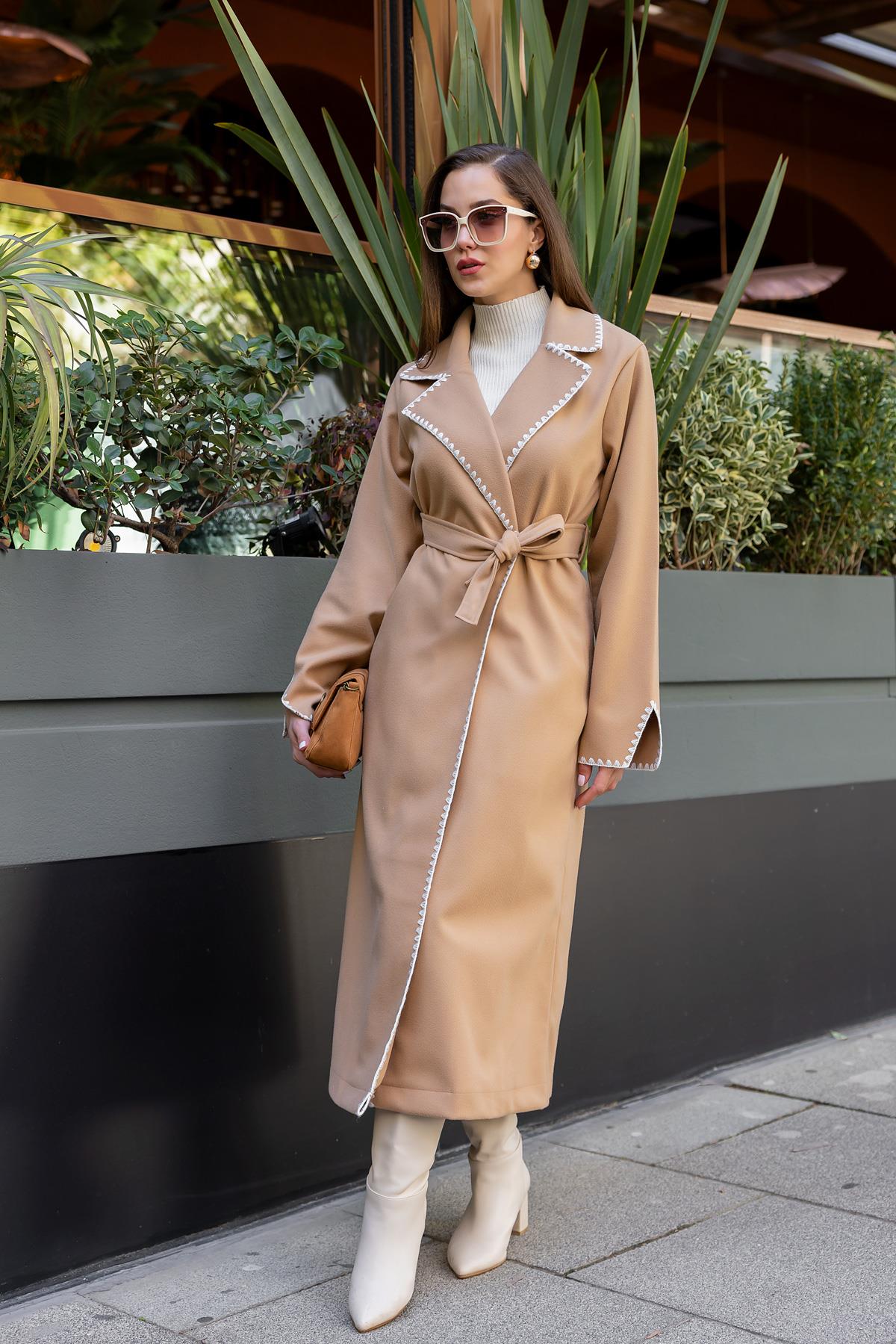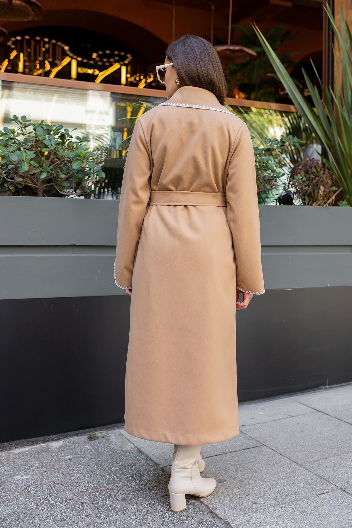 Ürün 36-40 bedene kadar uyumlu, kol yaka ve ön kısmı nakış desenli, kuşaklı, astarsız, kaşe, kaban olarak tasarlanmıştır.
