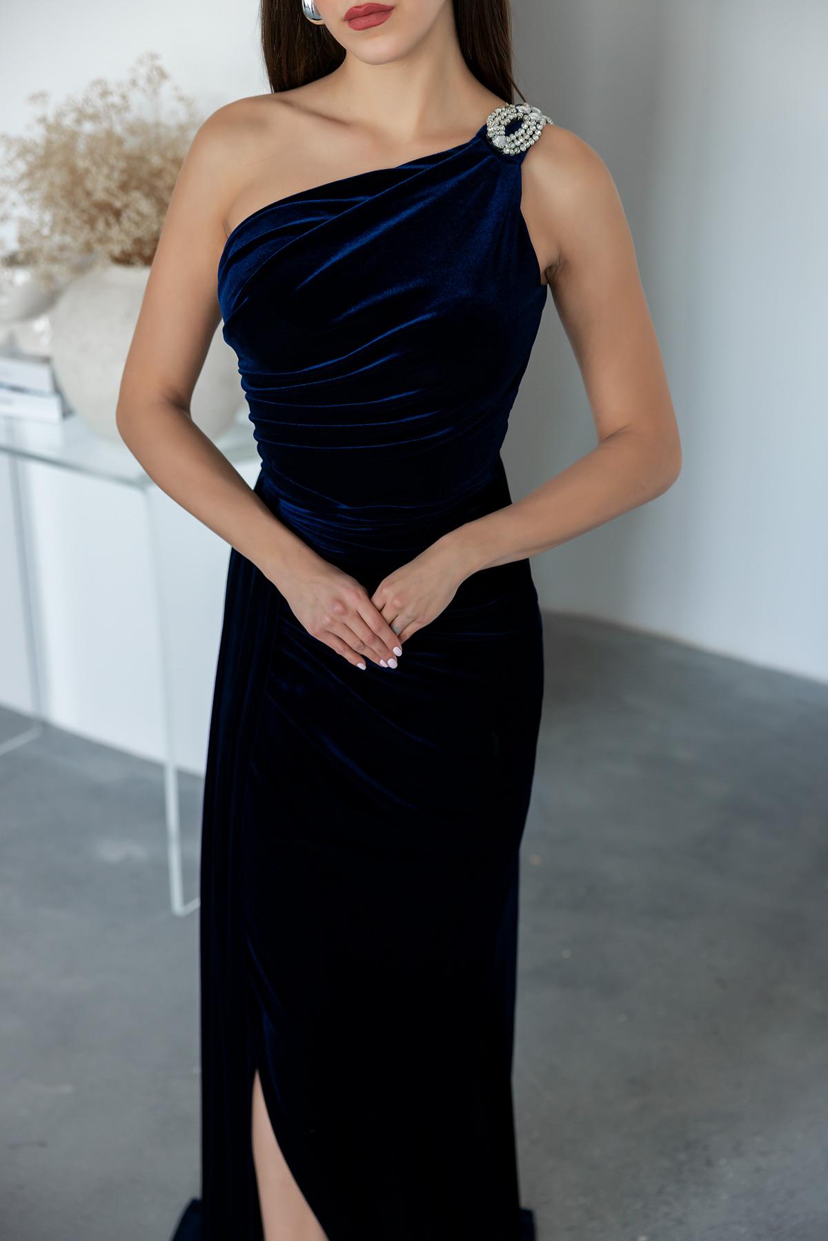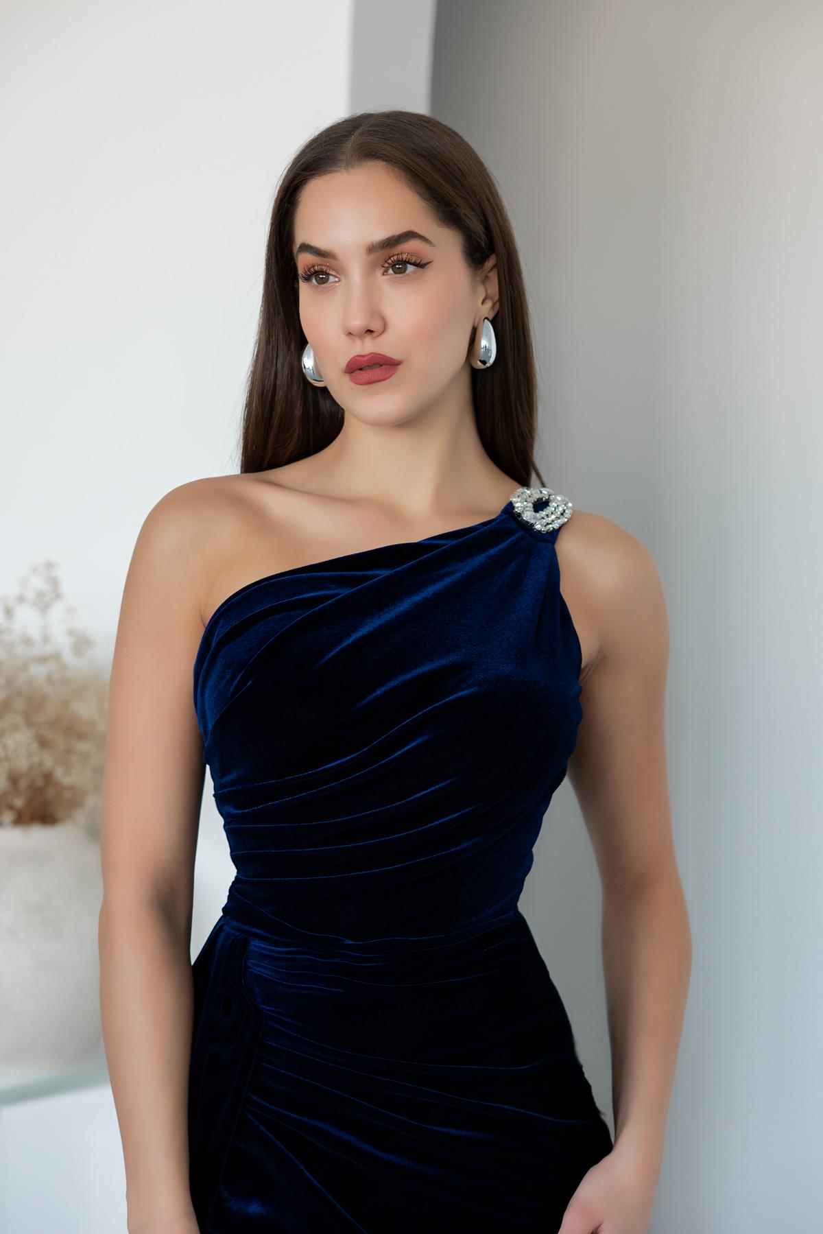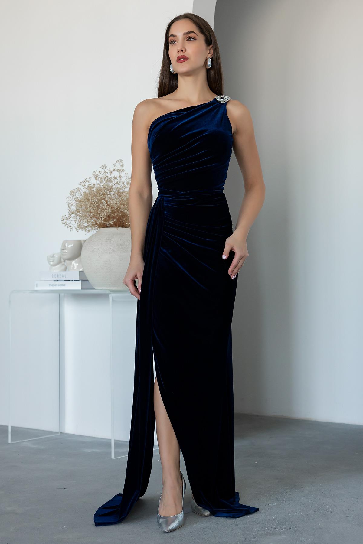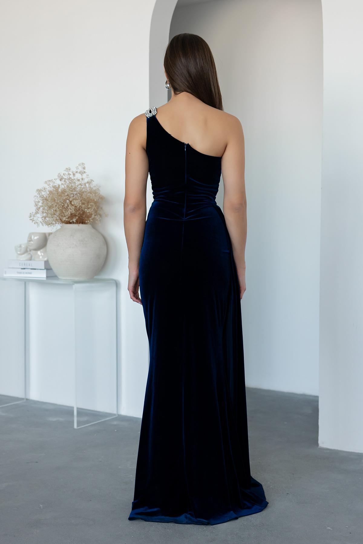 Omuz Taşlı Uzun Kadife Abiye - LACİVERT (BEW008ABY0006110)