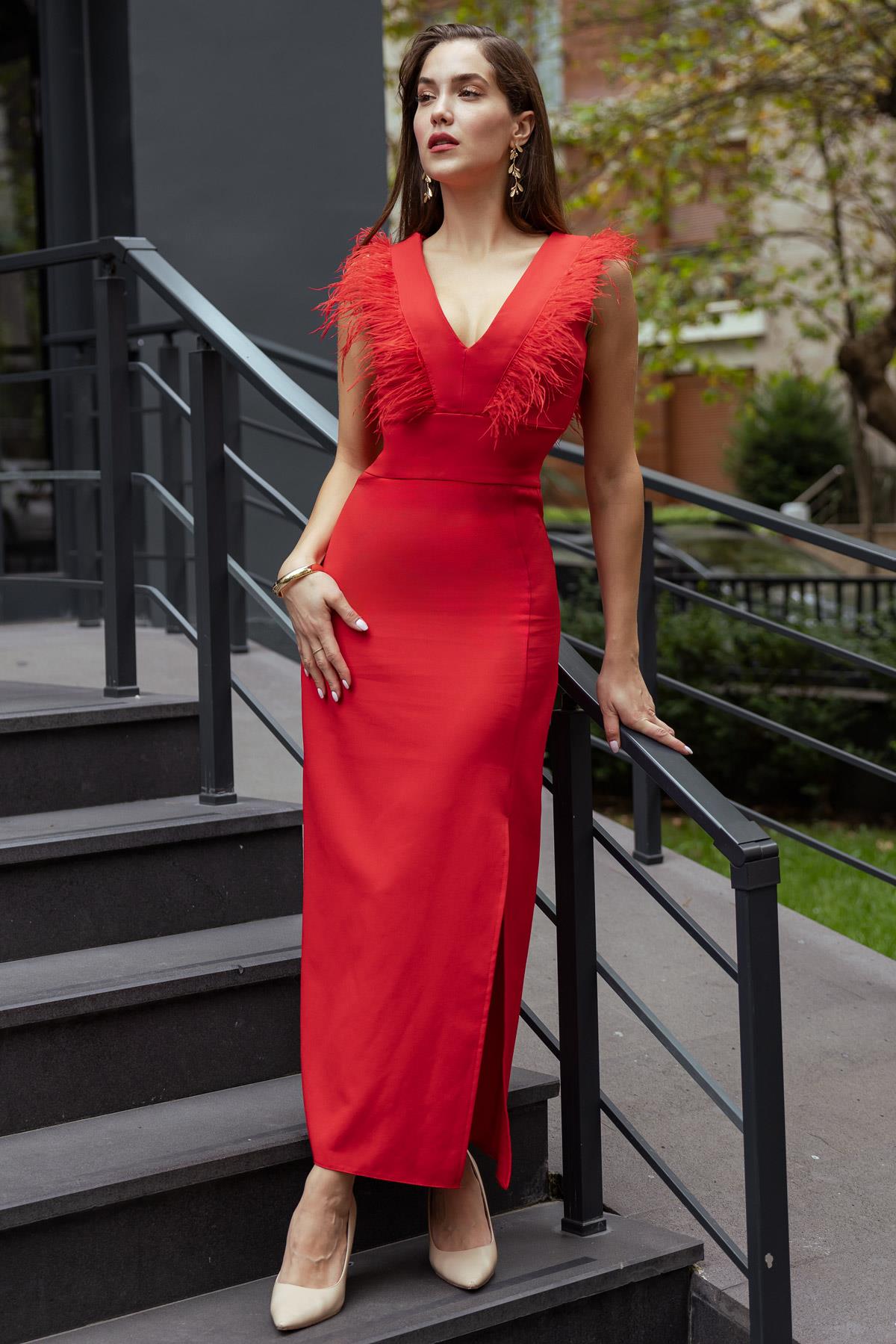 Otriş Detay Uzun Elbise - KIRMIZI (BEW383ELB0003124)