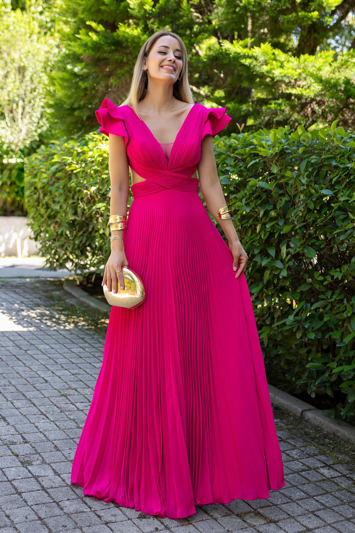 Ürün 38-40 bedene kadar uyumlu, sırt fermuar kapamalı, göğüs pedli, sırt ip bağlama detaylı, sırt dekolteli, göğüs piliseli, omuz fırfır detaylı, abiye olarak tasarlanmıştır.