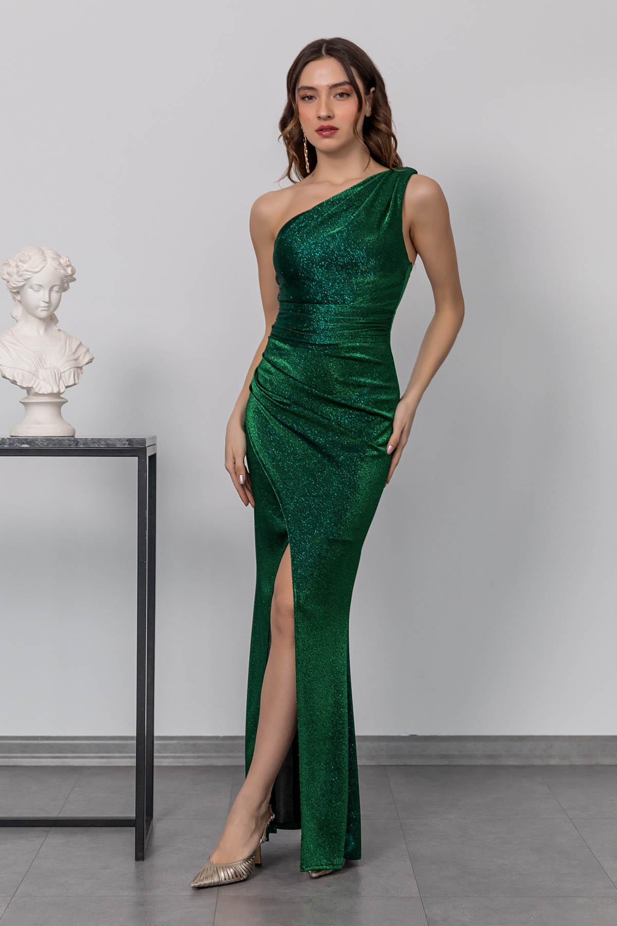 Tek Omuz Işıltılı Abiye - ZÜMRÜT YEŞİL (BDS008ABY0001201)